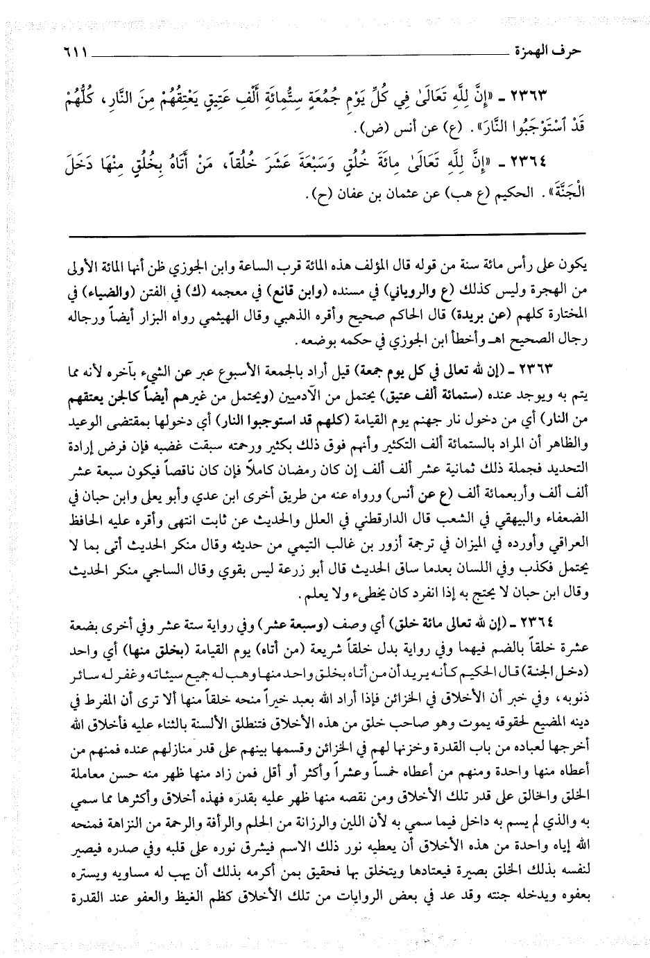 2363 - (إن لله تعالى في كل يوم جمعة) قيل أراد بالجمعة الأسبوع عبر عن الشئ بآخره لأنه مما يتم به ويوجد عنده (ستمائة ألف عتيق) يحتمل من الآدميين (ويحتمل من غيرهم أيضا كالجن يعتقهم من النار) أي من دخول نار جهنم يوم القيامة (كلهم قد استوجبوا النار) أي دخولها بمقتضى الوعيد والظاهر أن المراد بالستمائة ألف التكثير وأنهم فوق ذلك بكثير ورحمته سبقت غضبه فإن فرض إرادة