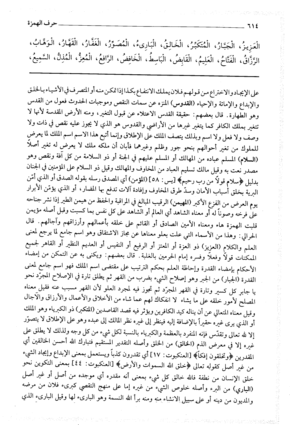 قال بعضهم : ويكنى به عن التمكن من إمضاء الأحكام بإمضاء القدرة وإحاطة العلم بحكم الترتيب على مقتضى اسم الملك فهو اسم جامع لمعنى القدرة (الجبار) من الجبر وهو إصلاح الشئ بضرب من القهر ثم يطلق تارة في الإصلاح المجرد نحو يا جابر كل كسير وتارة في القهر المجرد ثم تجوز فيه لمجرد العلو لأن القهر مسبب عنه فقيل معناه المصلح لأمور خلقه على ما يشاء لا انفكاك لهم عما شاء من الأخلاق والأعمال والأرزاق والآجال وقيل معناه المتعالي عن أن يناله كيد الكافرين ويؤثر فيه قصد القاصدين (المتكبر) ذو الكبرياء وهو الملك أو الذي يرى غيره حقيرا بالإضافة إليه فينظر إلى غيره نظر المالك إلى عبده وهو على الإطلاق لا يتصور إلا لله تعالى وتقدس فإنه المنفرد بالعظمة والكبرياء بالنسبة لكل شئ من كل وجه ولذلك لا يطلق على غيره إلا في معرض الذم (الخالق) من الخلق وأصله التقدير المستقيم فتبارك الله أحسن الخالقين أي المقدرين * (وتخلقون إفكا) * [ العنكبوت : 17 ] أي تقدرون كذبا ويستعمل بمعنى الإبداع وإيجاد الشئ من غير أصل كقوله تعالى * (خلق الله السماوات والأرض) * [ العنكبوت : 44 ] بمعنى التكوين نحو خلق الإنسان من نطفة فالله خالق كل شئ بمعنى أنه مقدره أي موجده من أصل أو غير أصل (الباري) من البرء وأصله خلوص الشئ من غيره إما على منهج التقصي كبرئ فلان من مرضه والمديون من دينه أو على سبيل الإنشاء منه ومنه برأ الله النسمة وهو البارئ لها وقيل البارئ الذي