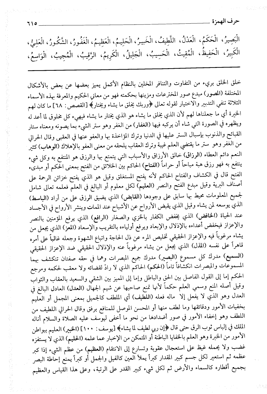 القبائح والذنوب بإسبال الستر عليها في الدنيا وترك المؤاخذة بها والعفو عنها في العقبى وقال الحرالي من الغفر وهو ستر ما يقتضي العلم غيبة وترك العقاب يلحقه من معنى العفو بالإهلاك (الوهاب) كثير النعم دائم العطاء (الرزاق) خالق الأرزاق والأسباب التي يتمتع بها والرزق وهو المنتفع به وكل شئ ينتفع به فهو رزق هبة مباحا أو حراما (الفتاح) الحاكم بين الخلائق من الفتح بمعنى الحكم أو مبدئ الفتح قال في الكشاف والفتاح الحاكم لأنه يفتح المستغلق وقيل هو الذي يفتح خزائن الرحمة على أصناف البرية وقيل مبدع الفتح والنصر (العليم) لكل معلوم أو البالغ في العلم فعلمه تعالى شامل لجميع المعلومات محيط بها سابق على وجودها (القابض) الذي يضيق الرزق على من أراد (الباسط) الذي يوسعه لمن يشاء وقيل الذي يقبض الأرواح عن الأشباح عند الممات وينشر الأرواح في الأجساد عند الحياة (الخافض) الذي يخفض الكفار بالخزي والصغار (الرافع) الذي يرفع المؤمنين بالنصر والإعزاز فيخفض أعداءه بالإذلال والإبعاد ويرفع أولياءه بالتقريب والإسعاد (المعز) الذي يجعل من يشاء مرغوبا فيه والإعزاز الحقيقي تخليص المرء عن ذل الحاجة واتباع الشهوة وجعله غالبا على أمره قاهرا على نفسه (المذل) الذي يجعل من يشاء مرغوبا عنه والإذلال ضد الإعزاز الحقيقي (السميع) مدرك كل مسموع (البصير) مدرك جميع المبصرات وهما في حقه صفتان تنكشف بهما المسموعات والمبصرات انكشافا تاما (الحكم) الحاكم الذي لا راد لقضائه ولا معقب لحكمه ومرجع الحكم إما إلى القول الفاصل بين الحق والباطل وإما إلى المميز بين الشقي والسعيد بالعقاب والثواب وقيل أصله المنع وسمي العلم حكما لأنها تمنع صاحبها عن شيم الجهال (العدل) العادل البالغ في العدل وهو الذي لا يفعل إلا ما له فعله (اللطيف) أي الملطف كالجميل بمعنى المجمل أو العليم بخفيات الأمور ودقائقها وما لطف منها أو المحسن الموصل للمنافع برفق وقال الحرالي اللطيف من اللطف وهو إخفاء الأمور في صور أضدادها من نحو ما أخفى ليوسف عليه الصلاة والسلام أناله الملك في إلباس ثوب الرق حتى قال * (إن ربي لطيف لما يشاء) * [ يوسف : 100 ] (الخبير) العليم ببواطن الأمور من الخبرة وهو العلم بالخفايا الباطنة أو المتمكن من الإخبار عما علمه (الحليم) الذي لا يستفزه غضب ولا يحمله غيظ على استعجال عقوبة وتسارع إلى الانتقام (العظيم) من عظم الشئ إذا كبر
