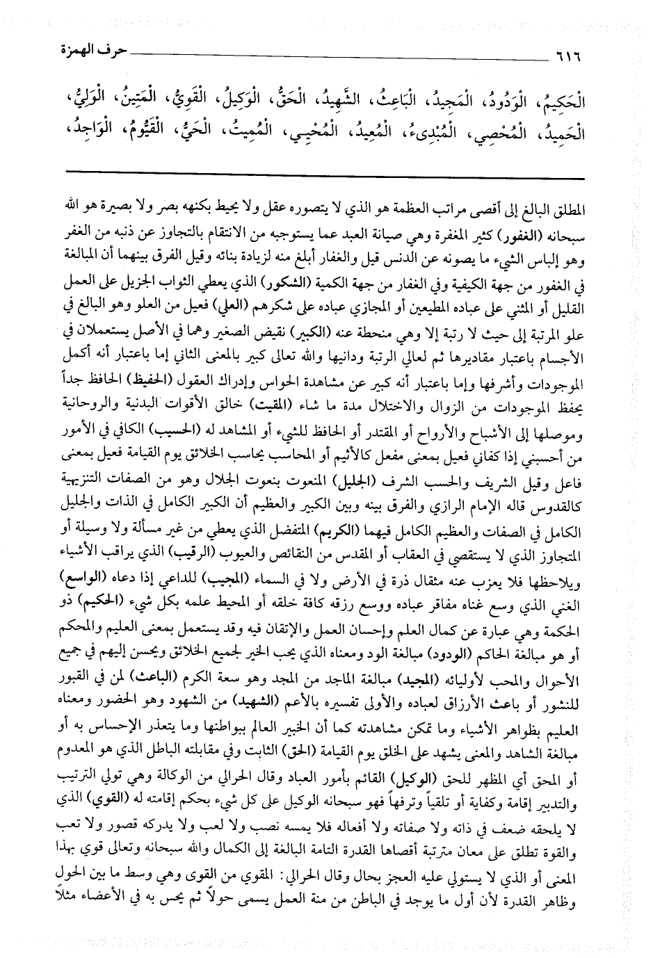 المطلق البالغ إلى أقصى مراتب العظمة هو الذي لا يتصوره عقل ولا يحيط بكنهه بصر ولا بصيرة هو الله سبحانه (الغفور) كثير المغفرة وهي صيانة العبد عما يستوجبه من الانتقام بالتجاوز عن ذنبه من الغفر وهو إلباس الشئ ما يصونه عن الدنس قيل والغفار أبلغ منه لزيادة بنائه وقيل الفرق بينهما أن المبالغة في الغفور من جهة الكيفية وفي الغفار من جهة الكمية (الشكور) الذي يعطي الثواب الجزيل على العمل القليل أو المثني على عباده المطيعين أو المجازي عباده على شكرهم (العلي) فعيل من العلو وهو البالغ في علو المرتبة إلى حيث لا رتبة إلا وهي منحطة عنه (الكبير) نقيض الصغير وهما في الأصل يستعملان في الأجسام باعتبار مقاديرها ثم لعالي الرتبة ودانيها والله تعالى كبير بالمعنى الثاني إما باعتبار أنه أكمل الموجودات وأشرفها وإما باعتبار أنه كبير عن مشاهدة الحواس وإدراك العقول (الحفيظ) الحافظ جدا يحفظ الموجودات من الزوال والاختلال مدة ما شاء (المقيت) خالق الأقوات البدنية والروحانية وموصلها إلى الأشباح والأرواح أو المقتدر أو الحافظ للشئ أو المشاهد له (الحسيب) الكافي في الأمور من أحسبني إذا كفاني فعيل بمعنى مفعل كالأثيم أو المحاسب يحاسب الخلائق يوم القيامة فعيل بمعنى فاعل وقيل الشريف والحسب الشرف (الجليل) المنعوت بنعوت الجلال وهو من الصفات التنزيهية كالقدوس قاله الإمام الرازي والفرق بينه وبين الكبير والعظيم أن الكبير الكامل في الذات والجليل الكامل في الصفات والعظيم الكامل فيهما (الكريم) المتفضل الذي يعطي من غير مسألة ولا وسيلة أو المتجاوز الذي لا يستقصي في العقاب أو المقدس من النقائص والعيوب (الرقيب) الذي يراقب الأشياء ويلاحظها فلا يعزب عنه مثقال ذرة في الأرض ولا في السماء (المجيب) للداعي إذا دعاه (الواسع) الغني الذي وسع غناه مفاقر عباده ووسع رزقه كافة خلقه أو المحيط علمه بكل شئ (الحكيم) ذو الحكمة وهي عبارة عن كمال العلم وإحسان العمل والإتقان فيه وقد يستعمل بمعنى العليم والمحكم أو هو مبالغة الحاكم (الودود) مبالغة الود ومعناه الذي يحب الخير لجميع الخلائق ويحسن إليهم في جميع