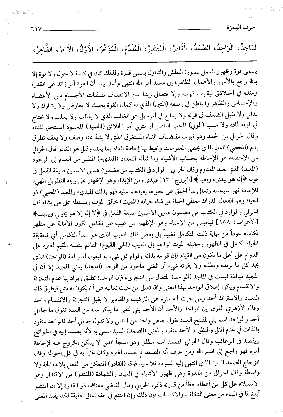 للإعادة فهو سبحانه وتعالى بدأ الخلق على نحو ما يعيدهم عليه فهو بذلك المبدئ والمعيد (المحيي) ذو الحياة وهو الفعال الدراك معطي الحياة لمن شاء حياته (المميت) خالق الموت ومسلطه على من يشاء قال الحرالي والوارد في الكتاب من مضمون هذين الاسمين صيغة الفعل في * (لا إله إلا هو يحيي ويميت) * [ الاعراف : 158 ] فيحيي من الإحياء وهو الإظهار من غيب عن تكامل تكون الأمانة على مظهر تكامله عودا من نهاية ذلك التكامل تغييبا إلى بعض ذلك الغيب الذي هو مبدأ التكامل أي فحقيقة الحياة تكامل في الظهور وحقيقة الموت تراجع إلى الغيب (الحي القيوم) القائم بنفسه المقيم لغيره على الدوام على أعلى ما يكون من القيام فإن قوامه بذاته وقوام كل شئ به فيعول للمبالغة (الواجد) الذي يجد كل ما يريده ويطلبه ولا يفوته شئ أو الغنى مأخوذ من الوجد (الماجد) يعني المجيد إلا أن في المجيد مبالغة ليست في الماجد (الواحد) المتعال عن التجزئ فإن الوحدة تطلق ويراد بها عدم التجزئة والانقسام ويكره إطلاق الواحد بهذا المعنى والله تعالى من حيث تعاليه عن أن يكون له مثل فيطرق ذاته التعدد والاشتراك أحد ومن حيث أنه منزه عن التركيب والمقادير لا يقبل التجزئة والانقسام واحد وقال الأزهري الفرق بين الواحد والأحد أن الأحد بني لنفي ما يذكر معه من العدد تقول ما جاءني أحد والواحد اسم بني لمفتتح العدد تقول جاءني واحد من الناس ولا تقول جاءني أحد فالواحد منفرد بالذات في عدم المثل والنظير والأحد منفرد بالمعنى (الصمد) السيد سمي به لأنه يصمد إليه في الحوائج ويقصد في الرغائب وقال الحرالي الصمد اسم مطلق وهو الملجأ الذي لا يمكن الخروج عنه لإحاطة أمره فهو راجع إلى اسم الله ومن عرف أنه الصمد لم يصمد لغيره وكان غنيا به في كل أحواله وقال الزجاج الصمد السيد الذي انتهى إليه السؤدد فلا سيد فوقه (القادر) المتمكن من الفعل بلا معالجة ولا واسطة وقال الحرالي من القدرة وهي ظهور الأشياء في العيان والشهادة (المقتدر) من الاقتدار وهو الاستيلاء على كل من أعطاه حظا من قدرته ذكره الحرالي وقال القاضي معناهما ذو القدرة إلا أن المقتدر أبلغ لما في البناء من معنى التكلف والاكتساب فإن ذلك وإن امتنع في حقه تعالى حقيقة لكنه يفيد المعنى