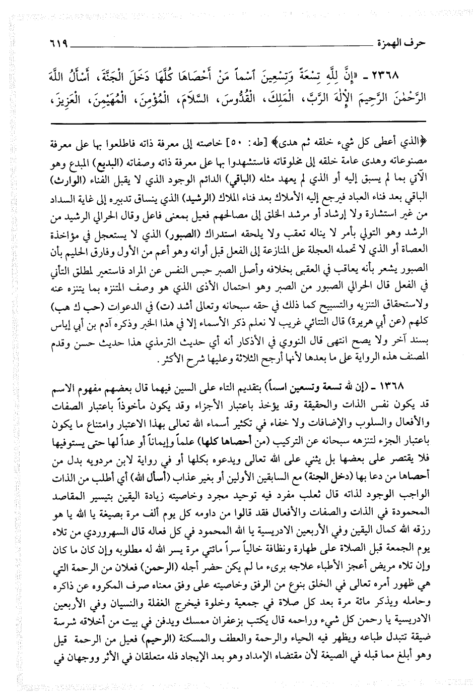 2368 - (إن لله تسعة وتسعين اسما) بتقديم التاء على السين فيهما قال بعضهم مفهوم الاسم قد يكون نفس الذات والحقيقة وقد يؤخذ باعتبار الأجزاء وقد يكون مأخوذا باعتبار الصفات والأفعال والسلوب والإضافات ولا خفاء في تكثير أسماء الله تعالى بهذا الاعتبار وامتناع ما يكون