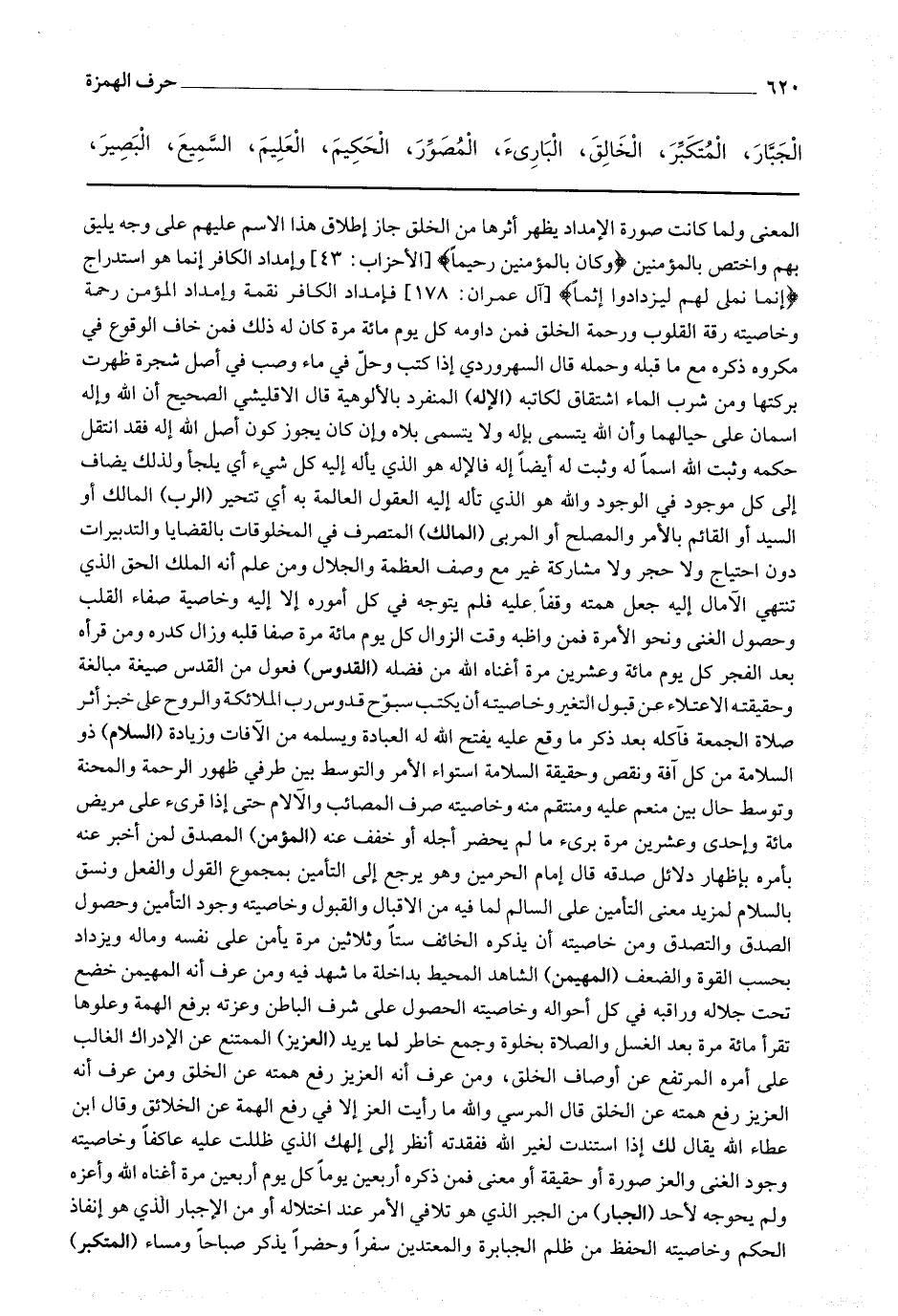 حكمه وثبت الله اسما له وثبت له أيضا إله فالإله هو الذي يأله إليه كل شئ أي يلجأ ولذلك يضاف إلى كل موجود في الوجود والله هو الذي تأله إليه العقول العالمة به أي تتحير (الرب) المالك أو السيد أو القائم بالأمر والمصلح أو المربي (المالك) المتصرف في المخلوقات بالقضايا والتدبيرات دون احتياج ولا حجر ولا مشاركة غير مع وصف العظمة والجلال ومن علم أنه الملك الحق الذي ينتهي الآمال إليه جعل همته وقفا عليه فلم يتوجه في كل أموره إلا إليه وخاصية صفاء القلب وحصول الغنى ونحو الأمرة فمن واظبه وقت الزوال كل يوم مائة مرة صفا قلبه وزال كدره ومن قرأه بعد الفجر كل يوم مائة وعشرين مرة أغناه الله من فضله (القدوس) فعول من القدس صيغة مبالغة وحقيقته الاعتلاء عن قبول التغير وخاصيته أن يكتب سبوح قدوس رب الملائكة والروح على خبز أثر صلاة الجمعة فآكله بعد ذكر ما وقع عليه يفتح الله له العبادة ويسلمه من الآفات وزيادة (السلام) ذو السلامة من كل آفة ونقص وحقيقة السلامة استواء الأمر والتوسط بين طرفي ظهور الرحمة والمحنة وتوسط حال بين منعم عليه ومنتقم منه وخاصيته صرف المصائب والآلام حتى إذا قرئ على مريض مائة وإحدى وعشرين مرة برئ ما لم يحضر أجله أو خفف عنه (المؤمن) المصدق لمن أخبر عنه بأمره بإظهار دلائل صدقه قال إمام الحرمين وهو يرجع إلى التأمين بمجموع القول والفعل ونسق بالسلام لمزيد معنى التأمين على السالم لما فيه من الإقبال والقبول وخاصيته وجود التأمين وحصول الصدق والتصديق ومن خاصيته أن يذكره الخائف ستا وثلاثين مرة يأمن على نفسه وماله ويزاد بحسب القوة والضعف (المهيمن) الشاهد المحيط بداخلة ما شهد فيه ومن عرف أنه المهيمن خضع تحت جلاله وراقبه في كل أحواله وخاصيته الحصول على شرف الباطن وعزته برفع الهمة وعلوها تقرأ مائة مرة بعد الغسل والصلاة بخلوة وجمع خاطر لما يريد (العزيز) الممتنع عن الإدراك الغالب على أمره المرتفع عن أوصاف الخلق ، ومن عرف أنه العزيز رفع همته عن الخلق ، ومن عرف أنه العزيز رفع همته عن الخلق أنه قال المرسي والله ما رأيت العز إلا في رفع الهمة عن الخلائق وقال ابن عطاء الله يقال لك إذا استندد لغير الله ففقدته أنظر إلى إلهك الذي ظللت عليه عاكفا وخاصيته وجود الغنى والعز صورة أو حقيقة أو معنى فمن ذكره أربعين يوما كل يوم أربعين مرة أغناه الله وأعزه