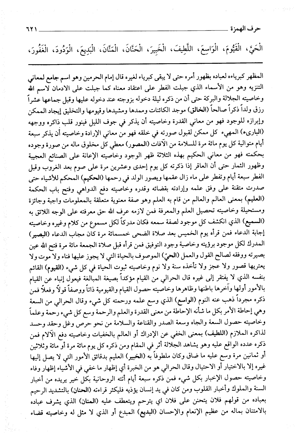 المظهر كبرياءه لعباده بظهور أمره حتى لا يبقى كبرياء لغيره قال إمام الحرمين وهو اسم جامع لمعاني التنزيه وهو من الأسماء الذي جبلت الفطر على اعتقاد معناه كما جبلت على الادمان لاسم الله وخاصيته الجلالة والبركة حتى أن من ذكره ليلة دخوله بزوجته عند دخوله عليها وقبل جماعها عشرا رزق ولدا ذكرا صالحا (الخالق) موجد الكائنات وممدها ومشيدها وقيومها والتخليق إيجاد الممكن وإبرازه للوجود فهو من معاني القدرة وخاصيته أن يذكر في جوف الليل فينور قلب ذاكره ووجهه (البارئ) المهئ كل ممكن لقبول صورته في خلقه فهو من معاني الإرادة وخاصيته أن يذكر سبعة أيام متوالية كل يوم مائة مرة للسلامة من الآفات (المصور) معطي كل مخلوق ماله من صورة وجوده بحكمته فهو من معاني الحكيم بهذه الثلاثة ظهر الوجود وخاصيته الإعانة على الصنائع العجيبة وظهور الثمار حتى أن العاقر إذا ذكرته كل يوم إحدى وعشرين مرة على صوم بعد الغروب وقبل الفطر سبعة أيام وتفطر على ماء زال عقمها ويصور الولد في رحمها (الحكيم) المحكم للأشياء حتى صدرت متقنة على وفق علمه وإرادته بقضائه وقدره وخاصيته دفع الدواهي وفتح باب الحكمة (العليم) بمعنى العالم والعالم من قام به العلم وهو صفة معنوية متعلقة بالمعلومات واجبة وجائزة ومستحيلة وخاصيته تحصيل العلم والمعرفة فمن لازمه عرف الله حق معرفته على الوجه اللائق به (السميع) الذي انكشف كل موجود لصفة سمعه فكان مدركا لكل مسموع من كلام وغيره وخاصيته إجابة الدعاء فمن قرأه يوم الخميس بعد صلاة الضحى خمسمائة مرة كان مجاب الدعاء (البصير) المدرك لكل موجود برؤيته وخاصية وجود التوفيق فمن قرأه قبل صلاة الجمعة مائة مرة فتح الله عين بصيرته ووفقه لصالح القول والعمل (الحي) الموصوف بالحياة التي لا يجوز عليها فناء ولا موت ولا يعتريها قصور ولا عجز ولا تأخذه سنة ولا نوم وخاصيته ثبوت الحياة في كل شئ (القيوم) القائم بنفسه الذي لا يفتقر إلى غيره قال الحرالي من القيام مؤكدا بصيغة المبالغة فيعول إنباء عن القيام