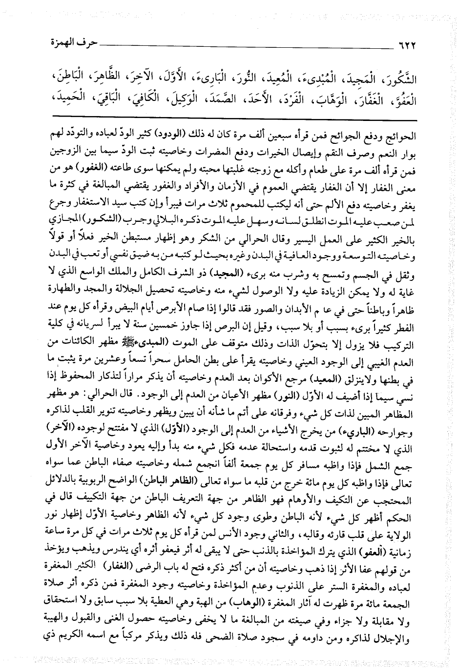غاية له ولا يمكن الزيادة عليه ولا الوصول لشئ منه وخاصيته تحصيل الجلالة والمجد والطهارة ظاهرا وباطنا حتى في عالم الأبدان والصور فقد قالوا إذا صام الأبرص أيام البيض وقرأه كل يوم عند الفطر كثيرا برئ بسبب أو بلا سبب ، وقيل إن البرص إذا جاوز خمسين سنة لا يبرأ لسريانه في كلية التركيب فلا يزول إلا بتحول الذات وذلك متوقف على الموت (المبدئ) مظهر الكائنات من العدم الغيبي إلى الوجود العيني وخاصيته يقرأ على بطن الحامل سحرا تسعا وعشرين مرة يثبت ما في بطنها ولا ينزلق (المعيد) مرجع الأكوان بعد العدم وخاصيته أن يذكر مرارا لتذكار المحفوظ إذا نسي سيما إذا أضيف له الأول (النور) مظهر الأعيان من العدم إلى الوجود.