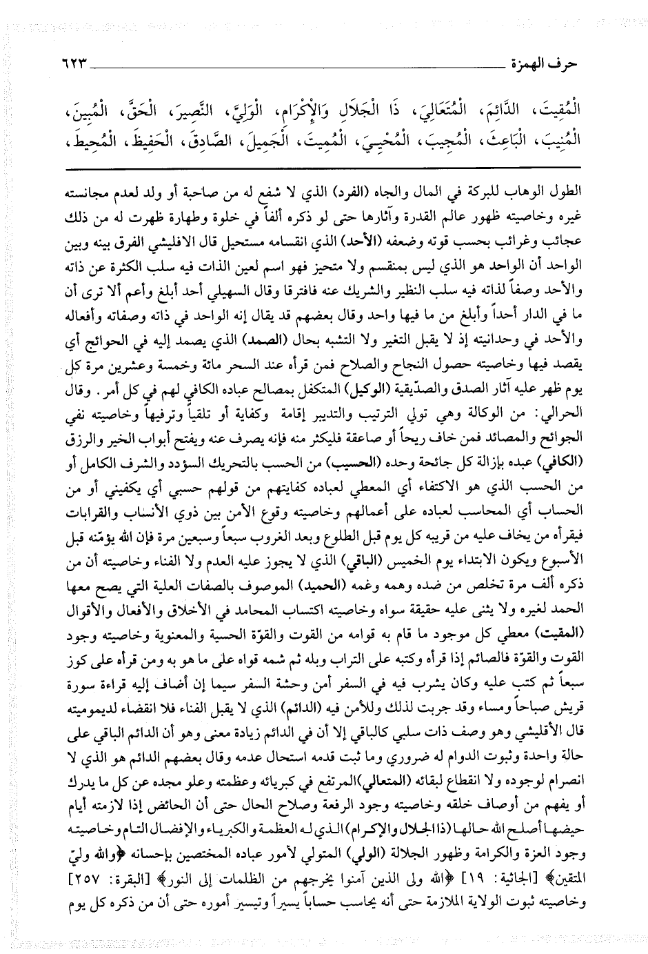 وقال الحرالي من الوكالة وهي تولي الترتيب والتدبير إقامة وكفاية أو تلقيا وتر فيها وخاصيته نفي الحوائج والصائد فمن خاف ريحا أو صاعقة فليكثر منه فإنه يصرف عنه ويفتح أبواب الخير والرزق (الكافي) عبده بإزالة كل جائحة وحده (الحسيب) من الحسب بالتحريك السؤدد والشرف الكامل أو من الحسب الذي هو الإكتفاء أي المعطي لعباده كفايتهم من قولهم حسبي أي يكفيني أو من الحساب أي المحاسب لعباده على أعمالهم وخاصيته وقوع الأمن بين ذوي الأنساب والقرابات فيقرأه من يخاف عليه من قريبه كل يوم قبل الطلوع وبعد الغروب سبعا وسبعين مرة فإن الله يؤمنه قبل الأسبوع ويكون الإبتداء يوم الخميس (الباقي) الذي لا يجوز عليه العدم ولا الفناء وخاصيته أن من ذكره ألف مرة تخلص من ضده وهمه وغمه (الحميد) الموصوف بالصفات العلية التي لا يصح معها الحمد لغيره ولا يثنى عليه حقيقة سواه وخاصيته إكتساب المحامد في الأخلاق والأفعال والأقوال (المقيت) معطي كل موجود ما قام به قوامه من القوت والقوة الحسية والمعنوية وخاصيته وجود القوت والقوة فالصائم إذا قرأه وكتبه على التراب وبله ثم شمه قواه على ما هو به ومن قرأه على كوز سبعا ثم كتب عليه وكان يشرب فيه في السفر أمن وحشة السفر سيما إن أضاف إليه قراءة سورة قريش صباحا ومساء وقد جربت لذلك وللأمن فيه (الدائم) الذي لا يقبل الفناء فلا انقضاء لديموميته