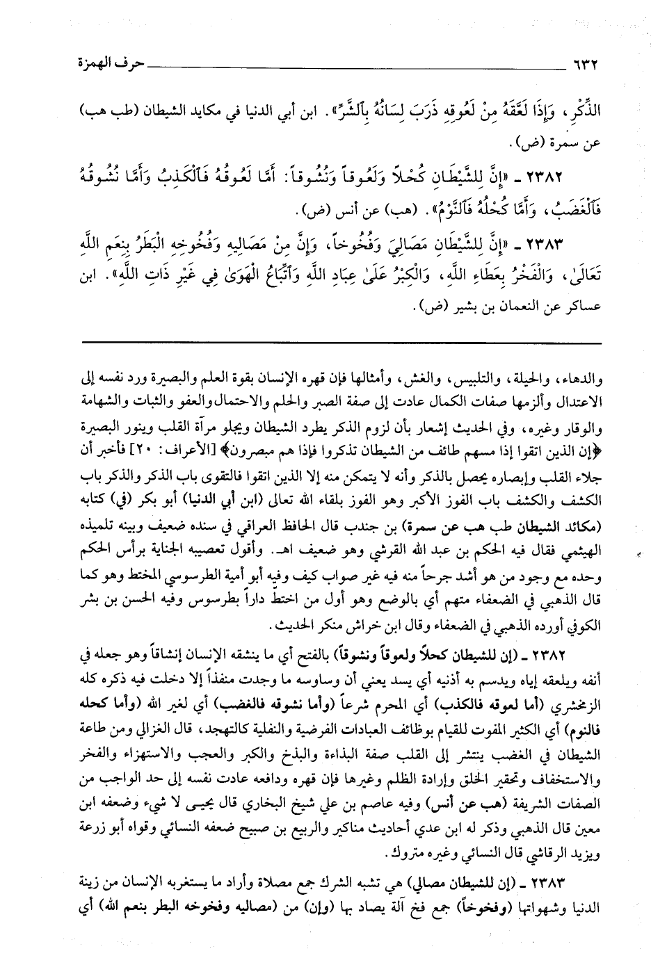 2382 - (إن للشيطان كحلا ولعوقا ونشوقا) بالفتح أي ما ينشقه الإنسان إنشاقا وهو جعله في أنفه ويلعقه إياه ويدسم به أذنيه أي يسد يعني أن وساوسه ما وجدت منفذا إلا دخلت فيه ذكره كله الزمخشري (أما لعوقه فالكذب) أي المحرم شرعا (وأما نشوقه فالغضب) أي لغير الله (وأما كحله فالنوم) أي الكثير المفوت للقيام بوظائف العبادات الفرضية والنفلية كالتهجد ، قال الغزالي ومن طاعة الشيطان في الغضب ينتشر إلى القلب صفة البذاءة والبذخ والكبر والعجب والاستهزاء والفخر والاستخفاف وتحقير الخلق وإرادة الظلم وغيرها فإن قهره ودافعه عادت نفسه إلى حد الواجب من الصفات الشريفة (هب عن أنس) وفيه عاصم بن علي شيخ البخاري قال يحيى لا شئ وضعفه ابن معين قال الذهبي وذكر له ابن عدي أحاديث مناكير والربيع بن صبيح ضعفه النسائي وقواه أبو زرعة ويزيد الرقاشي قال النسائي وغيره متروك.