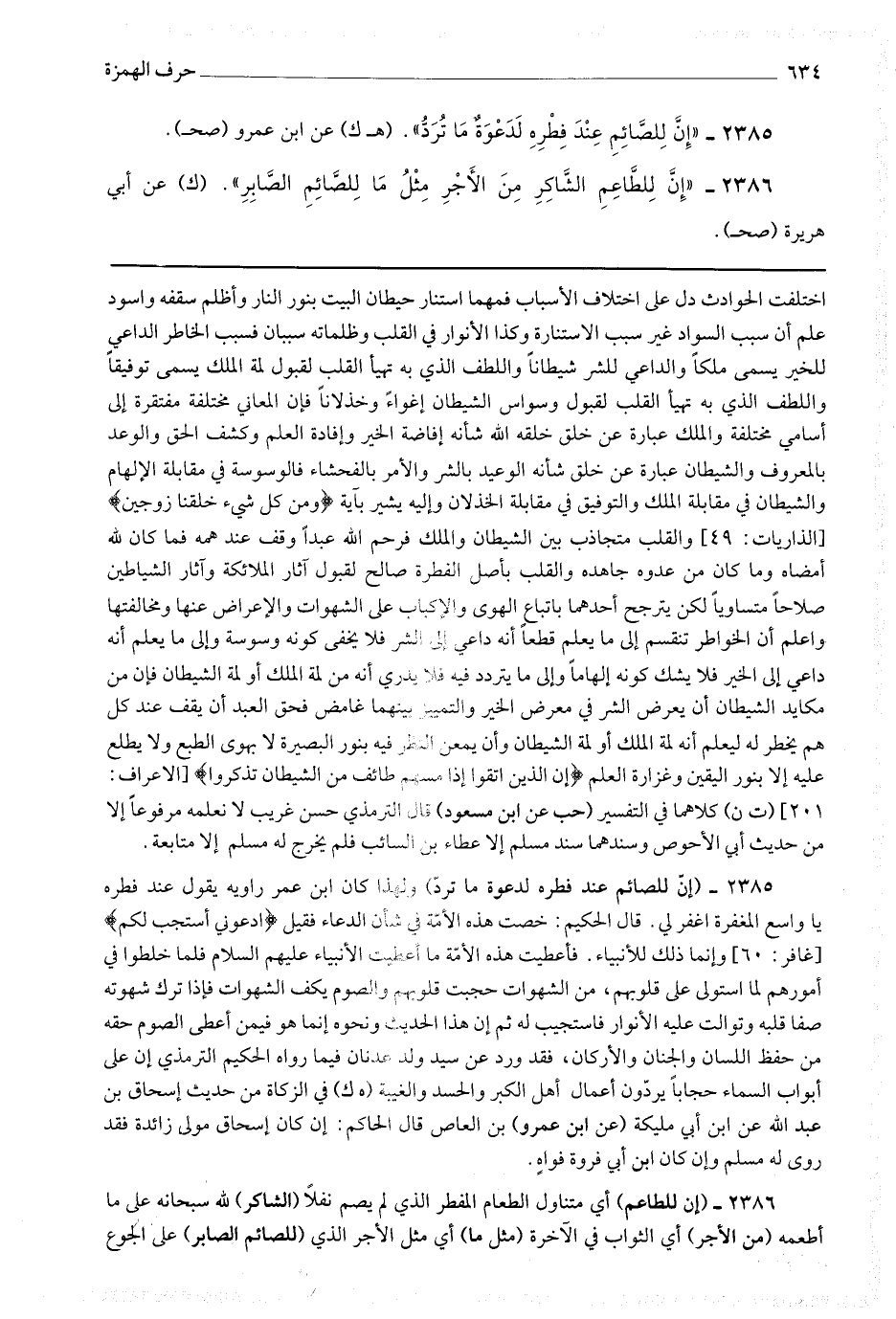 اختلفت الحوادث دل على اختلاف الأسباب فمهما استنار حيطان البيت بنور النار وأظلم سقفه واسود علم أن سبب السواد غير سبب الاستنارة وكذا الأنوار في القلب وظلماته سببان فسبب الخاطر الداعي للخير يسمى ملكا والداعي للشر شيطانا واللطف الذي به تهيأ القلب لقبول لمة الملك يسمى توقيفا واللطف الذي به تهيأ القلب لقبول وسواس الشيطان إغواءا وخذلانا فإن المعاني مختلفة إلى أسامي مختلفة والملك عبارة عن خلق خلقه الله شأنه إفاضة الخير وإفادة العلم وكشف الحق والوعد بالمعروف والشيطان عبارة عن خلق شأنه الوعيد بالشر والأمر بالفحشاء فالوسوسة في مقابلة الإلهام والشيطان في مقابلة الملك والتوفيق في مقابلة الخذلان وإليه يشير بآية * (ومن كل شئ خلقنا زوجين) * والقلب متجاذب بين الشيطان والملك فرحم الله عبدا وقف عند همه فما كان لله أمضاه وما كان من عدوه جاهده والقلب بأصل الفطرة صالح لقبول آثار الملائكة وآثار الشياطين صلاحا متساويا لكن يترجح أحدهما باتباع الهوى والاكباب على الشهوات والإعراض عنها ومخالفتها واعلم أن الخواطر تنقسم إلى ما يعلم قطعا أنه داعي إلى الشر فلا يخفى كونه وسوسة وإلى ما يعلم أنه داعي إلى الخير فلا يشك كونه إلهاما وإلى ما يتردد فيه فلا يدري أنه من لمة الملك أو لمة الشيطان فإن من مكايد الشيطان أن يعرض الشر في معرض الخير والتمييز بينهما غامض فحق العبد أن يقف عند كل هم يخطر له ليعلم أنه لمة الملك أو لمة الشيطان وأن يمعن النظر فيه بنور البصيرة لا بهوى الطبع ولا يطلع عليه إلا بنور اليقين وغزارة العلم * (إن الذين اتقوا إذا مسهم طائف من الشيطان تذكروا) * [ الاعراف : 201 ] (ت ن) كلاهما في التفسير (حب عن ابن مسعود) قال الترمذي حسن غريب لا نعلمه مرفوعا إلا من حديث أبي الأحوص وسندهما سند مسلم إلا عطاء بن السائب فلم يخرج له مسلم إلا متابعة.