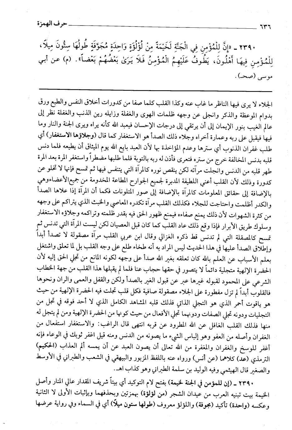 2390 - (إن للمؤمن في الجنة لخيمة) بفتح لام التوكيد أي بيتا شريف المقدار عالي المنار وأصل الخيمة بيت تبنيه العرب من عيدان الشجر (من لؤلؤة) بهمزتين وبحذفهما وبإثبات الأولى لا الثانية وعكسه (واحدة) تأكيد (مجوفة) واللؤلؤ معروف (طولها ستون ميلا) أي في السماء وفي رواية عرضها