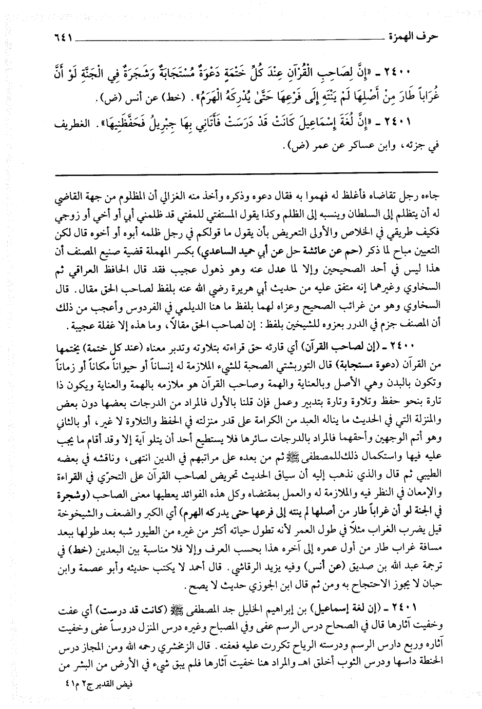2400 - (إن لصاحب القرآن) أي قارئة حق قراءته بتلاوته وتدبر معناه (عند كل ختمة) يختمها من القرآن (دعوة مستجابة) قال التوربشتي الصحبة للشئ الملازمة له إنسانا أو حيوانا مكانا أو زمانا وتكون بالبدن وهي الأصل وبالعناية والهمة وصاحب القرآن هو ملازمه بالهمة والعناية ويكون ذا تارة بنحو حفظ وتلاوة وتارة بتدبير وعمل فإن قلنا بالأول فالمراد من الدرجات بعضها دون بعض والمنزلة التي في الحديث ما يناله العبد من الكرامة على قدر منزلته في الحفظ والتلاوة لا غير ، أو بالثاني وهو أتم الوجهين وأحقهما فالمراد بالدرجات سائرها فلا يستطيع أحد أن يتلو آية إلا وقد أقام ما يجب عليه فيها واستكمال ذلك للمصطفى صلى الله عليه وسلم ثم من بعده على مراتبهم في الدين انتهى ، وناقشه في بعضه الطيبي ثم قال والذي نذهب إليه أن سياق الحديث تحريض لصاحب القرآن على التحري في القراءة والإمعان في النظر فيه والملازمة له والعمل بمقتضاه وكل هذه الفوائد يعطيها معنى الصاحب (وشجرة في الجنة لو أن غرابا طار من أصلها لم ينته إلى فرعها حتى يدركه الهرم) أي الكبر والضعف والشيخوخة قيل يضرب الغراب مثلا في طول العمر لأنه تطول حياته أكثر من غيره من الطيور شبه ببعد طولها ببعد مسافة غراب طار من أول عمره إلى آخره هذا بحسب العرف وإلا فلا مناسبة بين البعدين (خط) في ترجمة عبد الله بن صديق (عن أنس) وفيه يزيد الرقاشي.