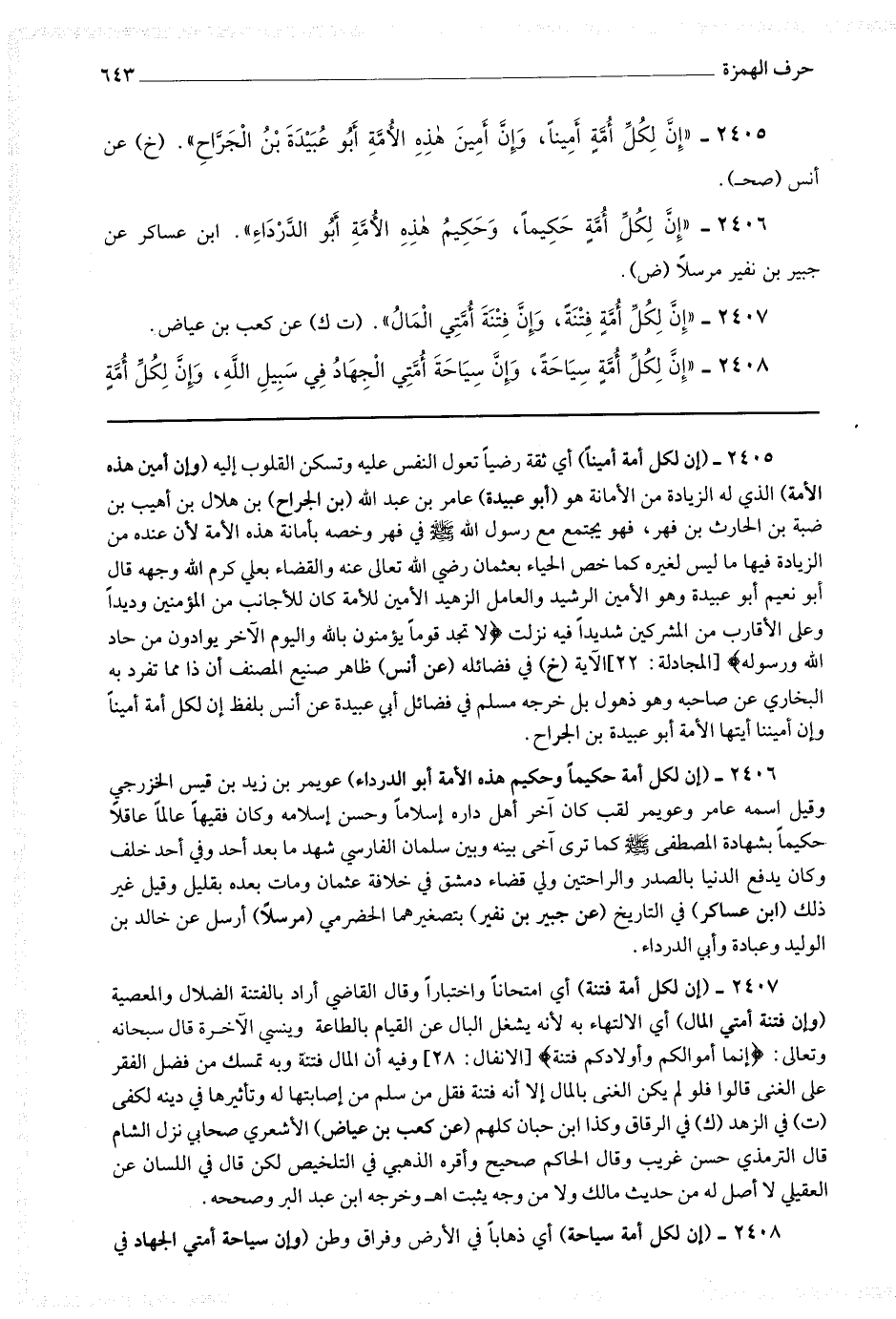 2405 - (إن لكل أمة أمينا) أي ثقة رضيا تعول النفس عليه وتسكن القلوب إليه (وإن أمين هذه الأمة) الذي له الزيادة من الأمانة هو (أبو عبيدة) عامر بن عبد الله (بن الجراح) بن هلال بن أهيب بن ضبة بن الحارث بن فهر ، فهو يجتمع مع رسول الله صلى الله عليه وسلم في فهر وخصه بأمانة هذه الأمة لأن عنده من الزيادة فيها ما ليس لغيره كما خص الحياء بعثمان رضي الله تعالى عنه والقضاء بعلي كرم الله وجهه قال أبو نعيم أبو عبيدة وهو الأمين الرشيد والعامل الزهيد الأمين للأمة كان للأجانب من المؤمنين وديدا وعلى الأقارب من المشركين شديدا فيه نزلت * (لا تجد قوما يؤمنون بالله واليوم الآخر يوادون من حاد الله ورسوله) * [ المجادلة : 22 ] الآية (خ) في فضائله (عن أنس) ظاهر صنيع المصنف أن ذا مما تفرد به البخاري عن صاحبه وهو ذهول بل خرجه مسلم في فضائل أبي عبيدة عن أنس بلفظ إن لكل أمة أمينا وإن أميننا أيتها الأمة أبو عبيدة بن الجراح.