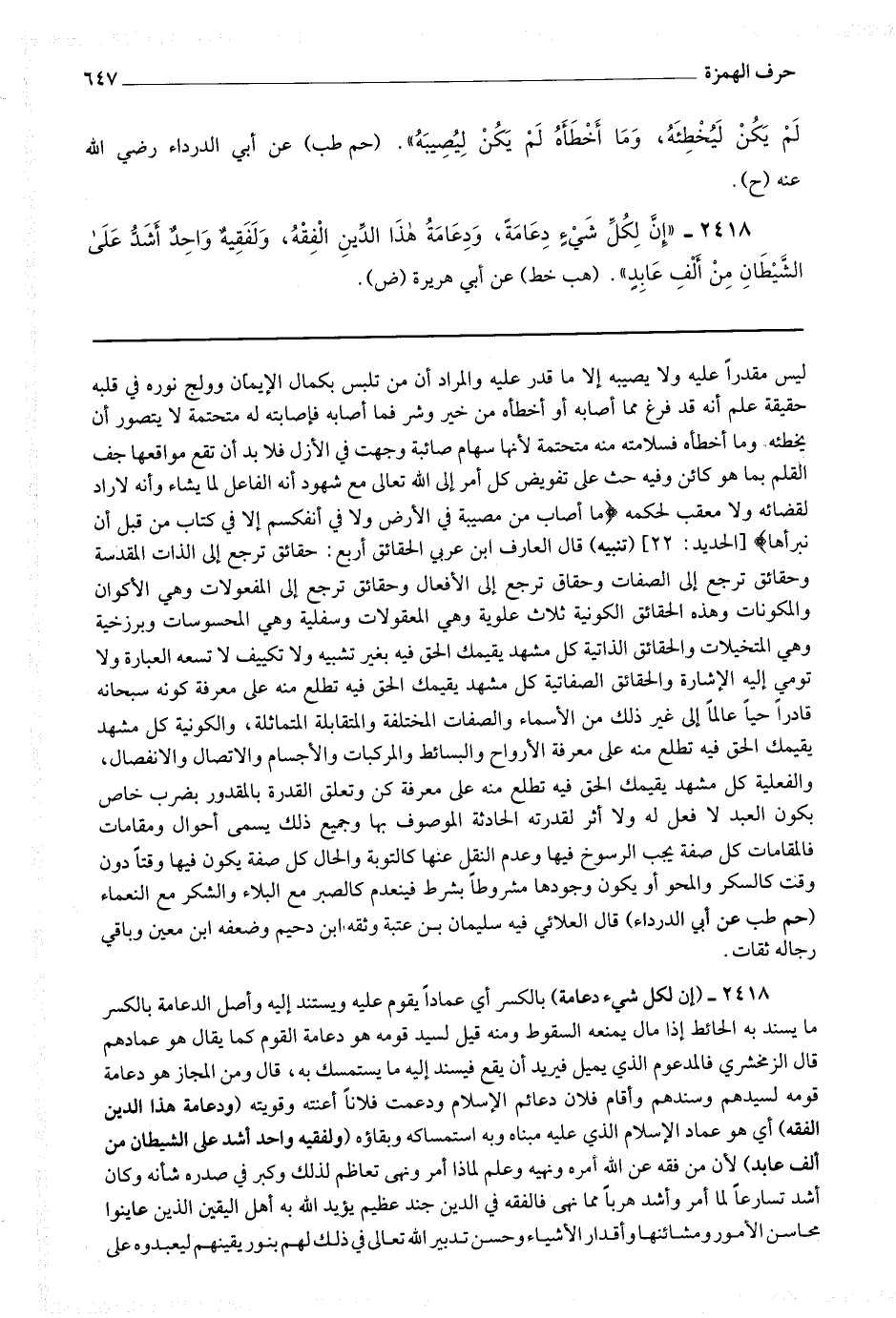 2418 - (إن لكل شئ دعامة) بالكسر أي عمادا يقوم عليه ويستند إليه وأصل الدعامة بالكسر ما يسند به الحائط إذا مال يمنعه السقوط ومنه قيل لسيد قومه هو دعامة القوم كما يقال هو عمادهم قال الزمخشري فالمدعوم الذي يميل فيريد أن يقع فيسند إليه ما يستمسك به ، قال ومن المجاز هو دعامة قومه لسيدهم وسندهم وأقام فلان دعائم الإسلام ودعمت فلانا أعنته وقويته (ودعامة هذا الدين الفقه) أي هو عماد الإسلام الذي عليه مبناه وبه استمساكه وبقاؤه (ولفقيه واحد أشد على الشيطان من ألف عابد) لأن من فقه عن الله أمره ونهيه وعلم لماذا أمر ونهى تعاظم لذلك وكبر في صدره شأنه وكان أشد تسارعا لما أمر وأشد هربا مما نهى فالفقه في الدين جند عظيم يؤيد الله به أهل اليقين الذين عاينوا محاسن الأمور ومشائنها وأقدار الأشياء وحسن تدبير الله تعالى في ذلك لهم بنور يقينهم ليعبدوه على