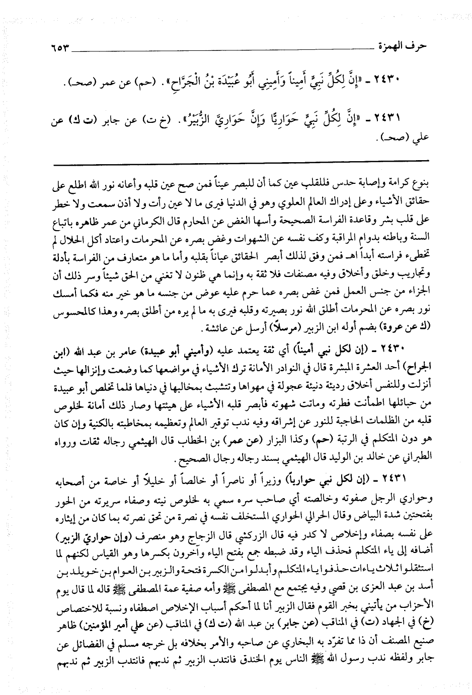 2430 - (إن لكل نبي أمينا) أي ثقة يعتمد عليه (وأميني أبو عبيدة) عامر بن عبد الله (ابن الجراح) أحد العشرة المبشرة قال في النوادر الأمانة ترك الأشياء في مواضعها كما وضعت وإنزالها حيث أنزلت وللنفس أخلاق رديئة دنيئة عجولة في مهواها وتتشبث بمخالبها في دنياها فلما تخلص أبو عبيدة من حبائلها اطمأنت فطرته وماتت شهوته فأبصر قلبه الأشياء على هيئتها وصار ذلك أمانة لخلوص قلبه من الظلمات الحاجبة للنور عن إشراقه وفيه ندب توفير العالم وتعظيمه بمخاطبته بالكنية وإن كان هو دون المتكلم في الرتبة (حم) وكذا البزار (عن عمر) بن الخطاب قال الهيثمي رجاله ثقات ورواه الطبراني عن خالد بن الوليد قال الهيثمي بسند رجاله رجال الصحيح.
