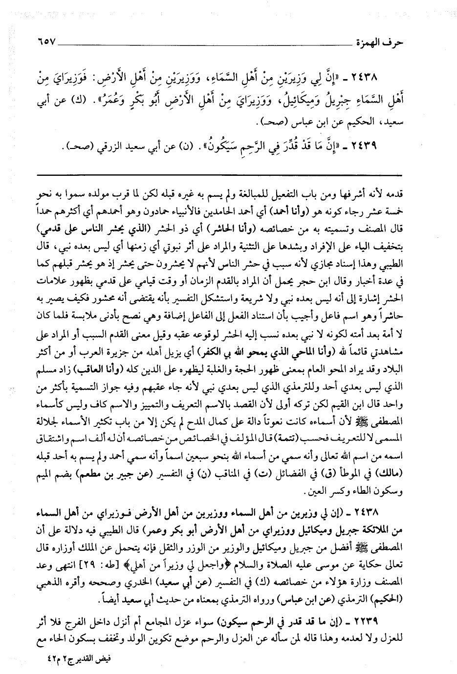 2438 - (إن لي وزيرين من أهل السماء ووزيرين من أهل الأرض فوزيراي من أهل السماء من الملائكة جبريل وميكائيل ووزيراي من أهل الأرض أبو بكر وعمر) قال الطيبي فيه دلالة على أن المصطفى صلى الله عليه وسلم أفضل من جبريل وميكائيل والوزير من الوزر والثقل فإنه يحتمل عن الملك أوزاره قال تعالى حكاية عن موسى عليه الصلاة والسلام * (واجعل لي وزيرا من أهلي) * [ طه : 29 ] انتهى وعد المصنف وزارة هؤلاء من خصائصه (ك) في التفسير (عن أبي سعيد) الخدري وصححه وأقره الذهبي (الحكيم) الترمذي (عن ابن عباس) ورواه الترمذي بمعناه من حديث أبي سعيد أيضا.