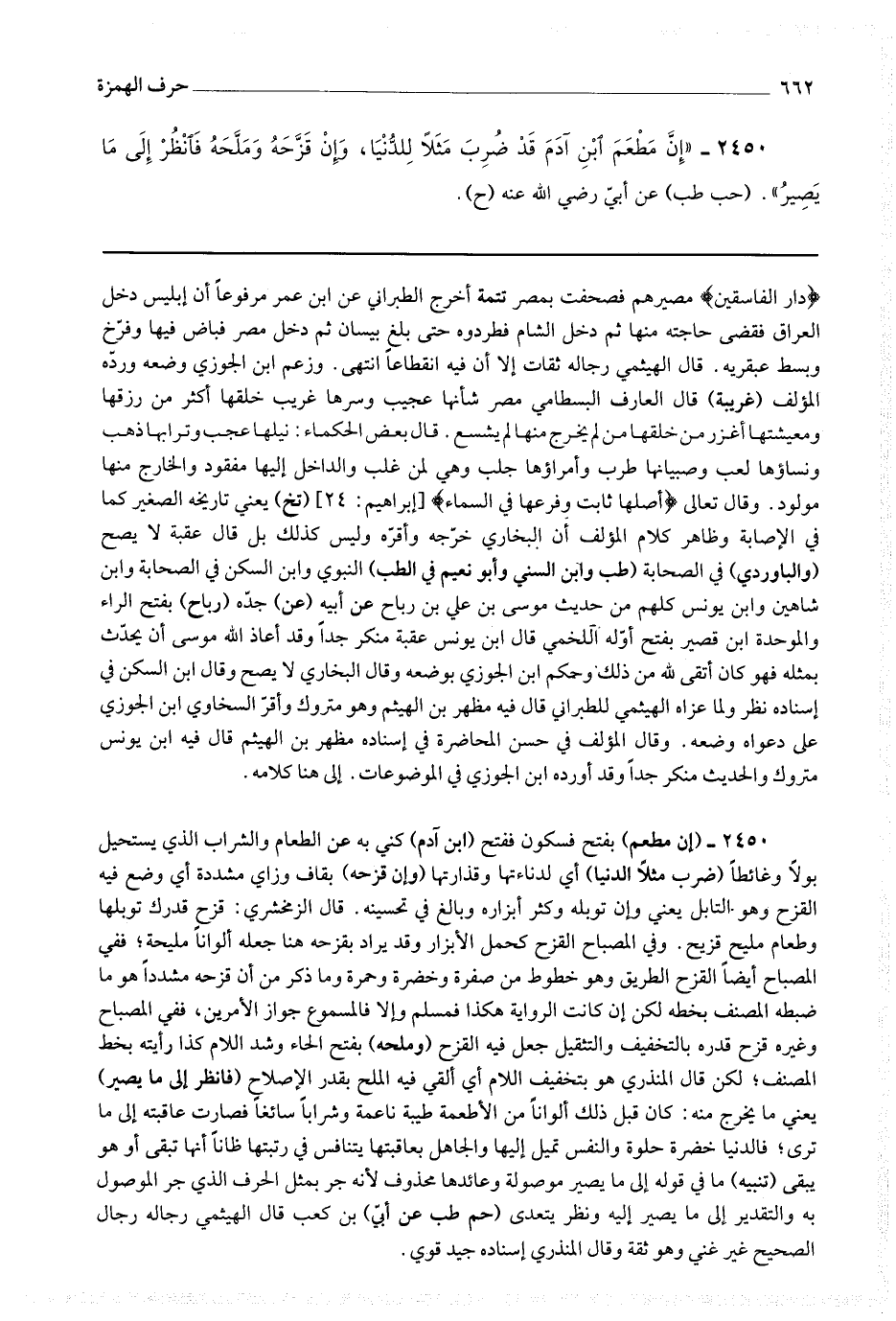 2450 - (إن مطعم) بفتح فسكون ففتح (ابن آدم) كنى به عن الطعام والشراب الذي يستحيل بولا وغائطا (ضرب مثلا الدنيا) أي لدناءتها وقذارتها (وإن قزحه) بقاف وزاي مشددة أي وضع فيه