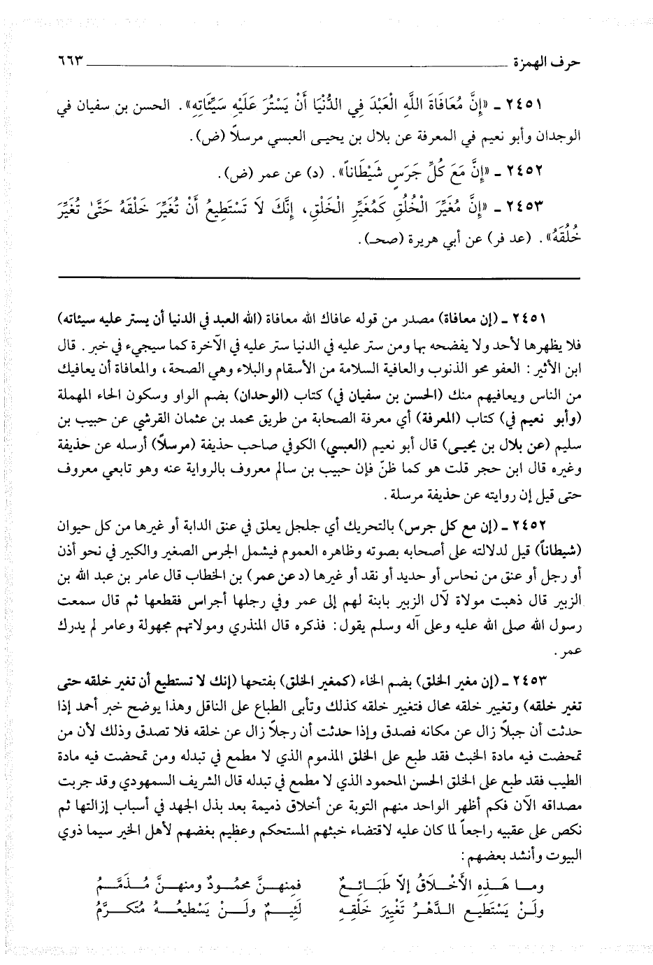 2453 - (إن مغير الخلق) بضم الخاء (كمغير الخلق) بفتحها (إنك لا تستطيع أن تغير خلقه حتى تغير خلقه) وتغيير خلقه محال فتغيير خلقه كذلك وتأبى الطباع على النافل وهذا يوضح خبر أحمد إذا حدثت أن جبلا زال عن مكانه فصدق وإذا حدثت أن رجلا زال عن خلقه فلا تصدق وذلك لأن من تمحضت فيه مادة الخبث فقد طبع على الخلق المذموم الذي لا مطمع في تبدله ومن تمحضت فيه مادة الطيب فقد طبع على الخلق الحسن المحمود الذي لا مطمع في تبدله قال الشريف السمهودي وقد جربت مصداقه الآن فكم أظهر الواحد منهم التوبة عن أخلاق ذميمة بعد بذل الجهد في أسباب إزالتها ثم نكص على عقبيه راجعا لما كان عليه لاقتضاء خبثهم المستحكم وعظيم بغضهم لأهل الخير سيما ذوي البيوت وأنشد بعضهم : وما هذه الأخلاق إلا طبائع * * فمنهن محمود ومنهن مذمم ولن يستطيع الدهر تغيير خلقه * * لئيم ولن يستطيعه متكرم