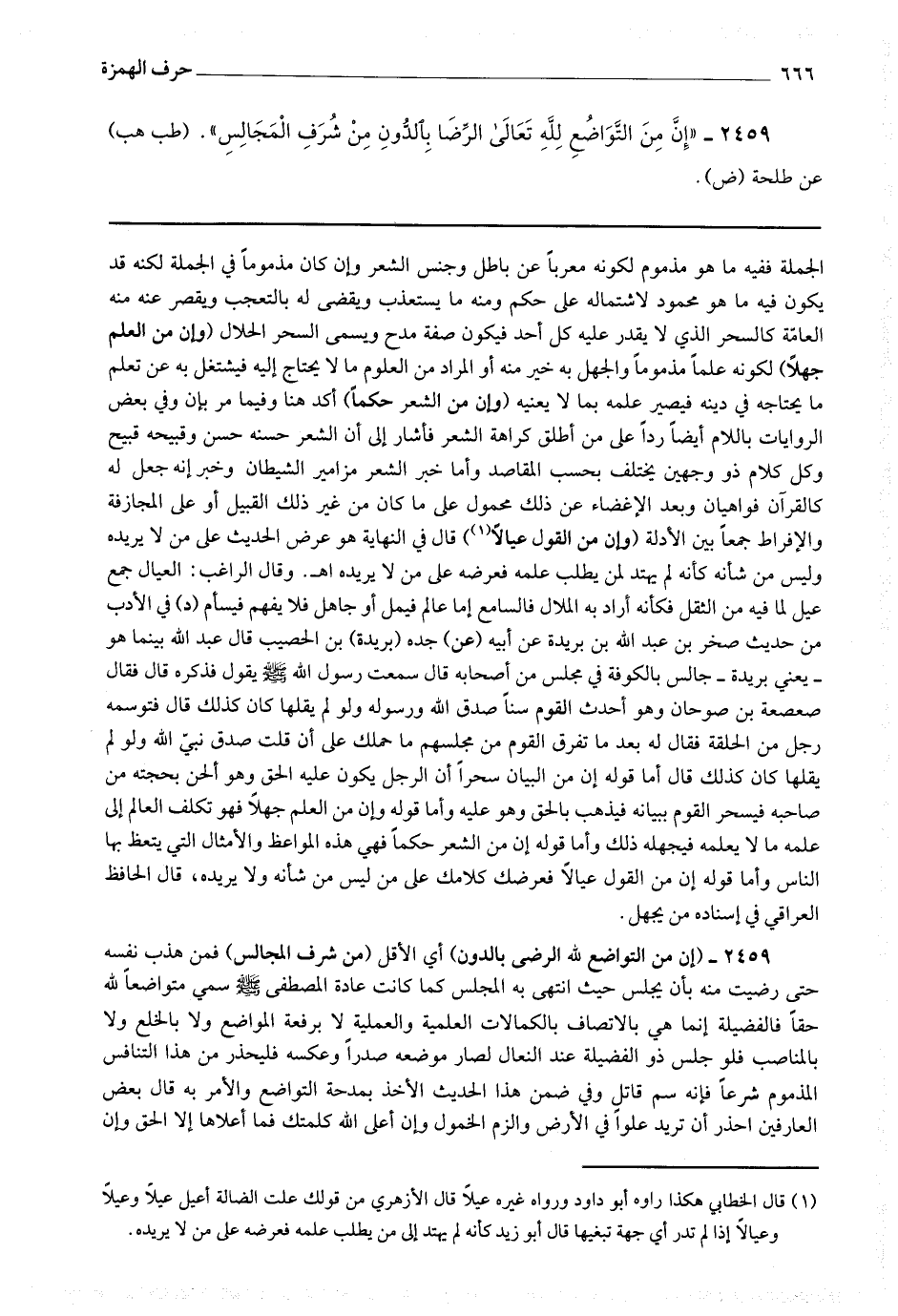 الجملة ففيه ما هو مذموم لكونه معربا عن باطل وجنس الشعر وإن كان مذموما في الجملة لكنه قد يكون فيه ما هو محمود لاشتماله على حكم ومنه ما يستعذب ويقضى له بالتعجب ويقصر عنه منه العامة كالسحر الذي لا يقدر عليه كل أحد فيكون صفة مدح ويسمى السحر الحلال (وإن من العلم جهلا) لكونه علما مذموما والجهل به خير منه أو المراد من العلوم ما لا يحتاج إليه فيشتغل به عن تعلم ما يحتاجه في دينه فيصير علمه مما لا يعنيه (وإن من الشعر حكما) أكد هنا وفيما مر بأن وفي بعض الروايات باللام أيضا ردا على من أطلق كراهة الشعر فأشار إلى أن الشعر حسنه حسن وقبيحه قبيح وكل كلام ذو وجهين يختلف بحسب المقاصد وأما خبر الشعر مزامير الشيطان وخبر إنه جعل له كالقرآن فواهيان وبعد الإغضاء عن ذلك محمول على ما كان من غير ذلك القبيل أو على المجازفة والإفراط جمعا بين الأدلة (وإن من القول عيالا (1) قال في النهاية هو عرض الحديث على من لا يريده وليس من شأنه كأنه لم يهتد لمن يطلب علمه فعرضه على من لا يريده اه.