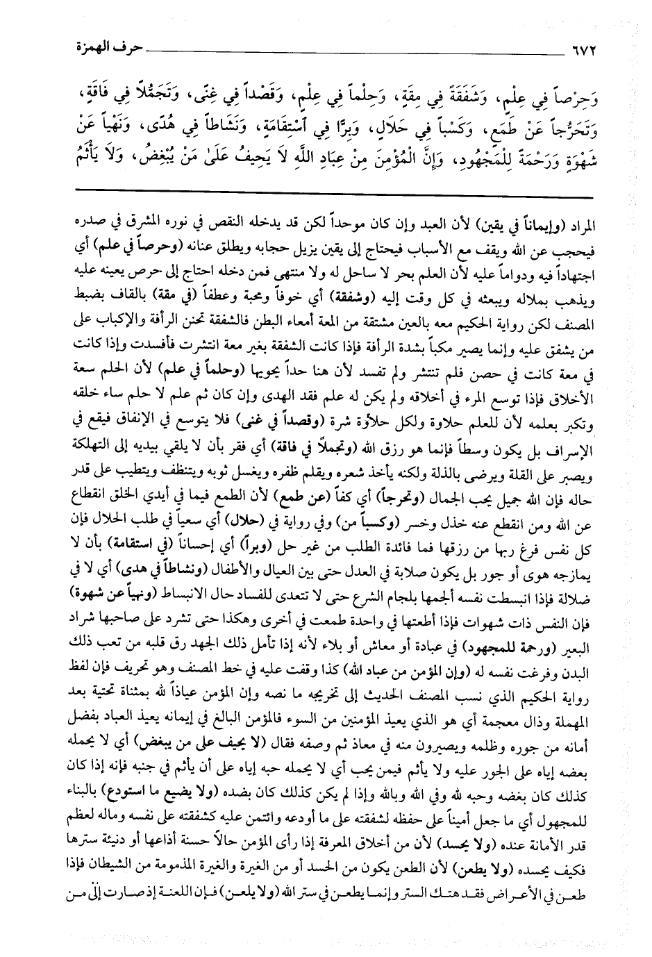 المراد (وإيمانا في يقين) لأن العبد وإن كان موحدا لكن قد يدخله النقص في نوره المشرق في صدره فيحجب عن الله ويقف مع الأسباب فيحتاج إلى يقين يزيل حجابه ويطلق عنانه (وحرصا في علم) أي اجتهادا فيه ودواما عليه لأن العلم بحر لا ساحل له ولا منتهى فمن دخله احتاج إلى حرص يعينه عليه ويذهب بملاله ويبعثه في كل وقت إليه (وشفقة) أي خوفا ومحبة وعطفا (في مقة) بالقاف بضبط المصنف لكن رواية الحكيم معه بالعين مشتقة من المعة أمعاء البطن فالشفقة تحنن الرأفة والإكباب على من يشفق عليه وإنما يصير منكبا بشدة الرأفة فإذا كانت الشفقة بغير معة انتشرت فأفسدت وإذا كانت في معة كانت في حصن فلم تنتشر ولم تفسد لأن هنا حدا يحويها (وحلما في علم) لأن الحلم سعة الأخلاق فإذا توسع المرء في أخلاقه ولم يكن له علم فقد الهدى وإن كان ثم علم لا حلم ساء خلقه وتكبر بعلمه لأن للعلم حلاوة ولكل حلاوة شرة (وقصدا في غنى) فلا يتوسع في الإنفاق فيقع في الإسراف بل يكون وسطا فإنما هو رزق الله (وتجملا في فاقة) أي فقر بأن لا يلقي بيديه إلى التهلكة ويصبر على القلة ويرضى بالذلة ولكته يأخذ شعره ويقلم ظفره ويغسل ثوبه ويتنظف ويتطيب على قدر حاله فإن الله جميل يحب الجمال (وتحرجا) أي كفا (عن طمع) لأن الطمع فيما في أيدي الخلق انقطاع عن الله ومن انقطع عنه خذل وخسر (وكسبا من) وفي رواية في (حلال) أي سعيا في طلب الحلال فإن كل نفس فرغ ربها من رزقها فما فائدة الطلب من غير حل (وبرأ) أي إحسانا (في استقامة) بأن لا يمازجه هوى أو جور بل يكون مع صلابة في العدل حتى بين العيال والأطفال (ونشاطا في هدى) أي لا في