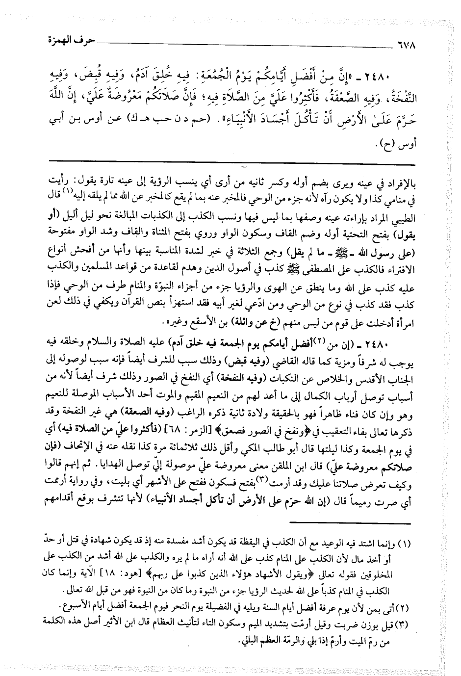 2480 - (إن من (2) أفضل أيامكم يوم الجمعة فيه خلق آدم) عليه الصلاة والسلام وخلقه فيه يوجب له شرفا ومزية كما قاله القاضي (وفيه قبض) وذلك سبب للشرف أيضا فإنه سبب لوصوله إلى الجناب الأقدس والخلاص عن النكبات (وفيه النفخة) أي النفخ في الصور وذلك شرف أيضا لأنه من أسباب توصل أرباب الكمال إلى ما أعد لهم من النعيم المقيم والموت أحد الأسباب الموصلة للنعيم