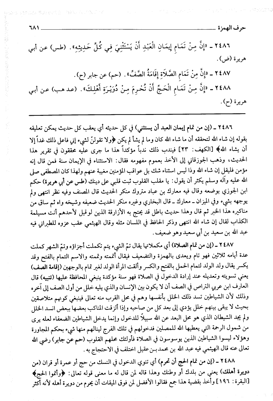 2486 - (إن من تمام إيمان العبد أن يستثنى) في كل حديثه أي يعقب كل حديث يمكن تعليقه بقوله إن شاء الله لتحققه أن ما شاء الله كان وما لم يشأ لم يكن * (ولا تقولن لشئ إني فاعل ذلك غدا إلا أن يشاء الله) * [ الكهف : 23 ] فيندب ذلك ندبا مؤكدا هذا ما جرى عليه محققون في تقرير هذا