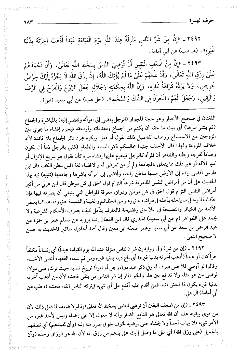 2492 - (إن من شر) وفي رواية إن شر (الناس منزلة عند الله يوم القيامة عبدا) أي إنسانا مكلفا حرا كان أو عبدا (أذهب آخرته بدنيا غيره) أي باع دينه بدنيا غيره ومن ثم سماه الفقهاء أخس الأخساء وقالوا لو أوصى للأخس صرف له وفي ذكر عبد دون رجل أو امرأة توبيخ شديد حيث ترك رضى مولاه لرضى من هو مثله ولا تدافع بين هذا والخبر المار إن شر الناس من يتقى فحشه لأن من أذهب آخرته بدنيا غيره يكون ذا فحش أشد فمن أقدم عليه على أي شئ شاء فيتركه الناس اتقاء فحشه (ه طب عن