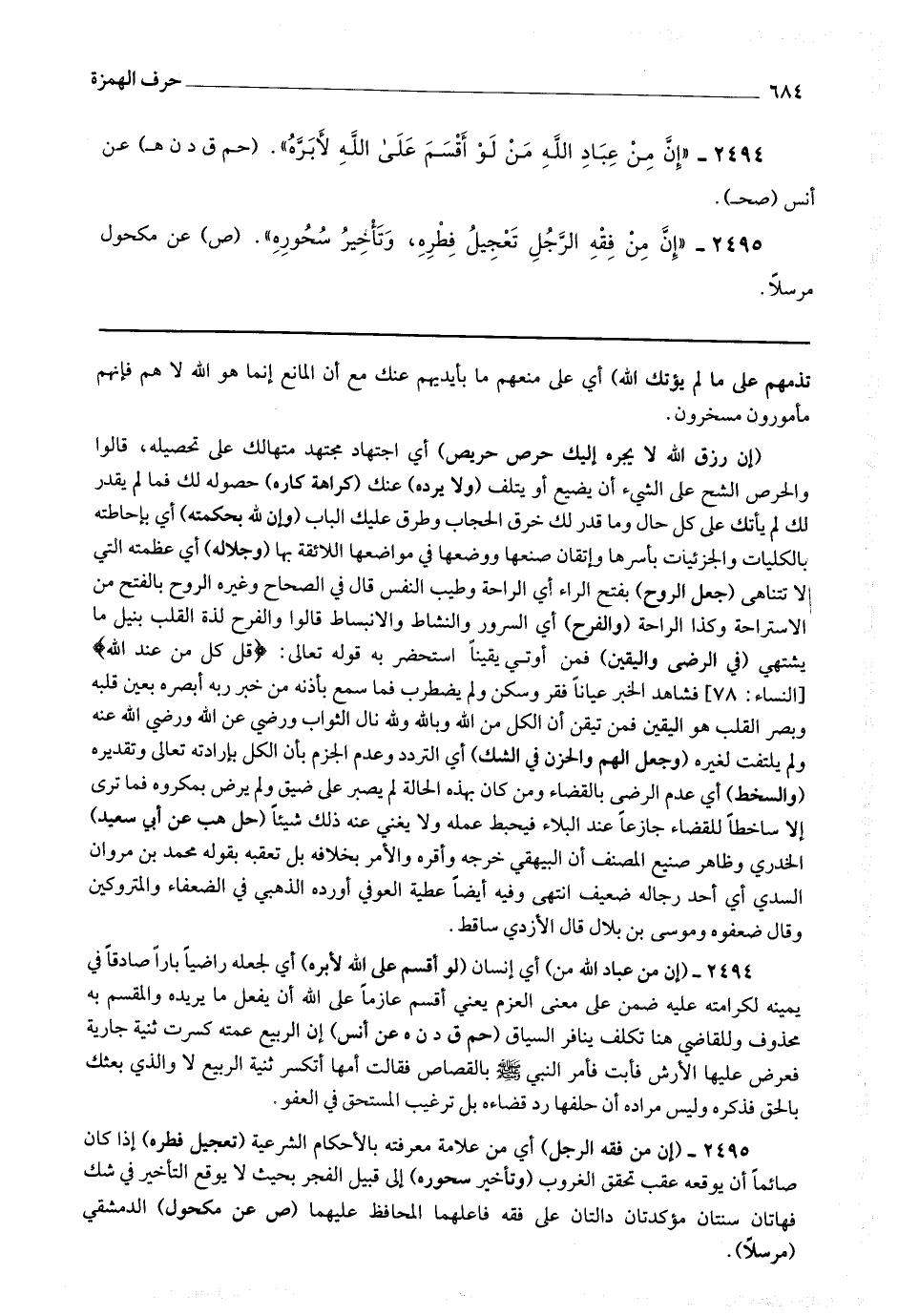 2494 - (إن من عباد الله من) أي إنسان (لو أقسم على الله لأبره) أي لجعله راضيا بارا صادقا في يمينه لكرامته عليه ضمن على معنى العزم يعني أقسم عازما على الله أن يفعل ما يريده والمقسم به محذوف وللقاضي هنا تكلف ينافر السياق (حم ق د ن ه عن أنس) إن الربيع عمته كسرت ثنية جارية فعرض عليها الأرش فأبت فأمر النبي صلى الله عليه وسلم بالقصاص فقالت أمها أتكسر ثنية الربيع لا والذي بعثك بالحق فذكره وليس مراده أن حلفها رد قضائه بل ترغيب المستحق في العفو.