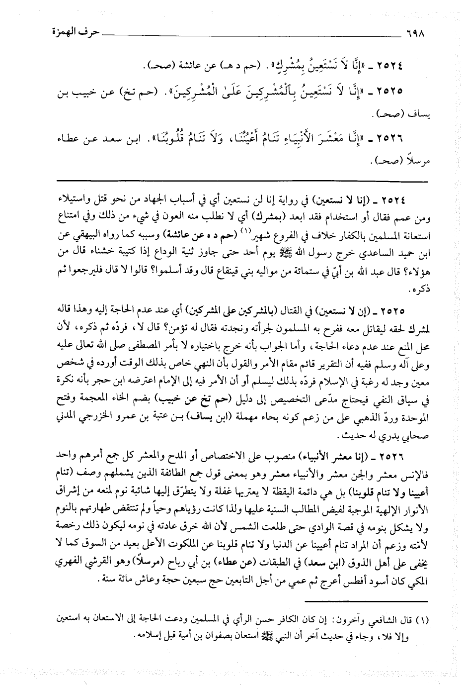 2524 - (إنا لا نستعين) في رواية إنا لن نستعين أي في أسباب الجهاد من نحو قتل واستيلاء ومن عمم فقال أو استخدام فقد أبعد (بمشرك) أي لا نطلب منه العون في شئ من ذلك وفي امتناع استعانة المسلمين بالكفار خلاف في الفروع شهير (1) (حم د ه عن عائشة) وسببه كما رواه البيهقي عن ابن حميد الساعدي خرج رسول الله صلى الله عليه وسلم يوم أحد حتى جاوز ثنية الوداع إذا كتيبة خشناء قال من هؤلاء ؟ قال عبد الله بن أبي في ستمائة من مواليه بني قينقاع قال وقد أسلموا ؟ قالوا لا قال فليرجعوا ثم ذكره.