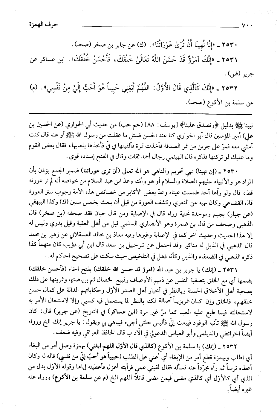 2531 - (إنك) يا جرير بن عبد الله (امرؤ قد حسن الله خلقك) بفتح الخاء (فأحسن خلقك) بضمها أي مع الخلق يتصفية النفس عن ذميم الأوصاف وقبيح الخصال ثم برياضتها وتمرينها على ذلك وبصحبة أهل الأخلاق الحسنة وبالنظر في أخبار أهل الصدر الأول وحكاياتهم الدالة على كمال حسن خلقهم فالخلق وإن كان غريزيا أصالة لكنه بالنظر لما يستعمل فيه كسبي وإلا لاستحال الأمر به لاستحالته فيما طبع عليه العبد كما مر غير مرة (ابن عساكر) في التاريخ (عن جرير) قال : كان رسول الله صلى الله عليه وسلم تأتيه الوفود فيبعث إلي فألبس حلتي أجئ فيباهي بي ويقول : يا جرير إنك إلخ ورواه أيضا الخرائطي والديلمي وأبو العباس الدعولي في الآداب قال الحافظ العراقي وفيه ضعف.