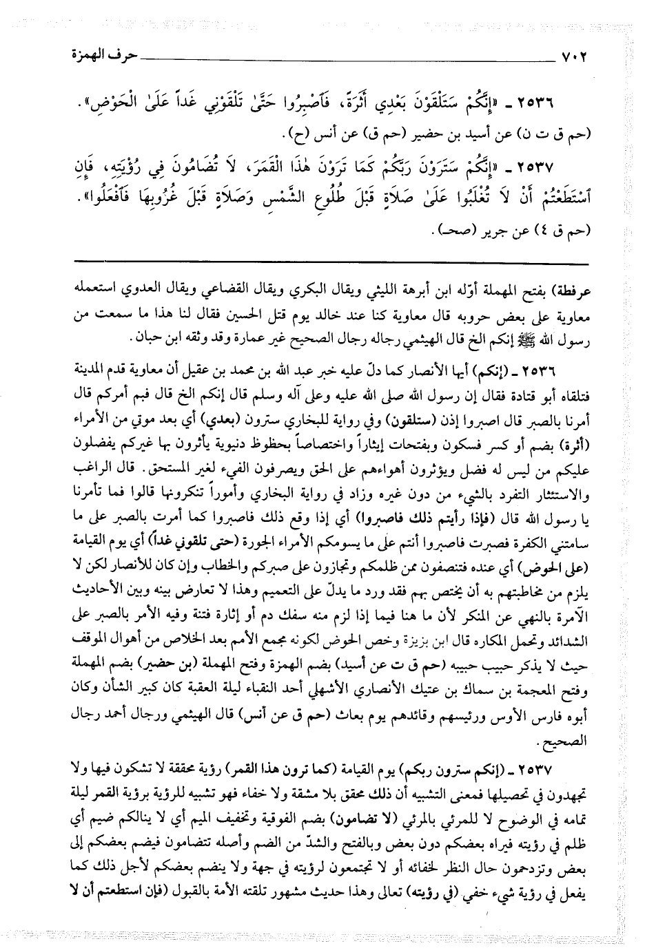 2536 - (إنكم) أيها الأنصار كما دل عليه خبر عبد الله بن محمد بن عقيل أن معاوية قدم المدينة فتلقاه أبو قتادة فقال إن رسول الله صلى الله عليه وعلى آله وسلم قال إنكم إلخ قال فيم أمركم قال أمرنا بالصبر قال اصبروا إذن (ستلقون) وفي رواية للبخاري سترون (بعدي) أي بعد موتي من الأمراء (أثرة) بضم أو كسر فسكون وبفتحات إيثارا واختصاصا بحظوظ دنيوية يأثرون بها غيركم يفضلون عليكم من ليس له فضل ويؤثرون أهواءهم على الحق ويصرفون الفئ لغير المستحق.