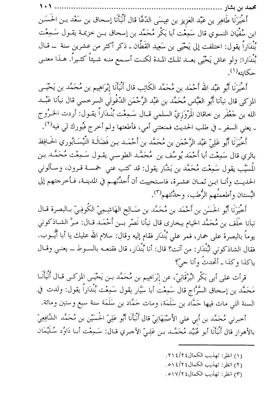 أَخْبَرَنَا طاهر بْن عَبْد العزيز بْن عيسى الدّعّا قال أنبأنا إسحاق بن سعد بن الحسن ابن سُفْيَان النَّسوي قَالَ سمعتُ أَبَا بَكْر مُحَمَّد بْن إِسْحَاق بْن خُزيمة يَقُول سمعتُ بُندارا يَقُولُ: اختلفت إِلَى يَحْيَى بْن سَعِيد القطان- ذكر أكثر من عشرين سنة- قال بندارا: ولو عاش يحيى بعد تلك المدة لكنت أسمع منه شيئا كثيرا. هذا معنى حكايته [1] .