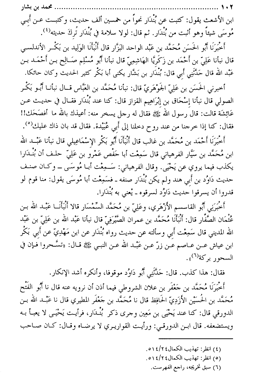 أَخْبَرَنَا أَبُو الْحَسَنِ مُحَمَّدُ بْنُ عَبْدِ الْوَاحِدِ البزّار قال أنبأنا الوليد بن بكر الأندلسي قال نبأنا علي بن أحمد بن زكريا الهاشمي قال نبأنا أبو مسلم صالح بن أحمد بن عبد الله قَالَ حَدَّثَنِي أبي قَالَ: بندار بن بشار يكنى أبا بكر كثير الحديث وكان حائكا.