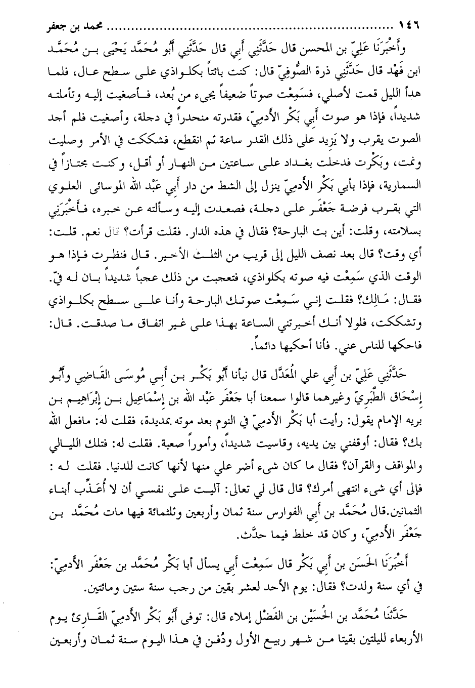حَدَّثَنِي عَلِيّ بْن أَبِي عَلِيّ المعدل قَالَ نبأنا أبو بكر بن أبي موسى القاضي وأبو إسحاق الطبري وغيرهما قالوا سمعنا أبا جَعْفَرٍ عَبْد اللَّه بْن إِسْمَاعِيل بْن إِبْرَاهِيم بن برية الإمام يقول: رأيت أبا بكر الأدمي في النوم بعد موته بمديدة، فقلتُ لَهُ: ما فعل اللَّه بك؟ فَقَالَ: أوقفني بين يديه، وقاسيت شديدا، وأمورا صعبة. فقلت له: فتلك الليالي والمواقف والقرآن؟ فقال ما كان شيء أضر علي منها لأنها كانت للدنيا. فقلت له: