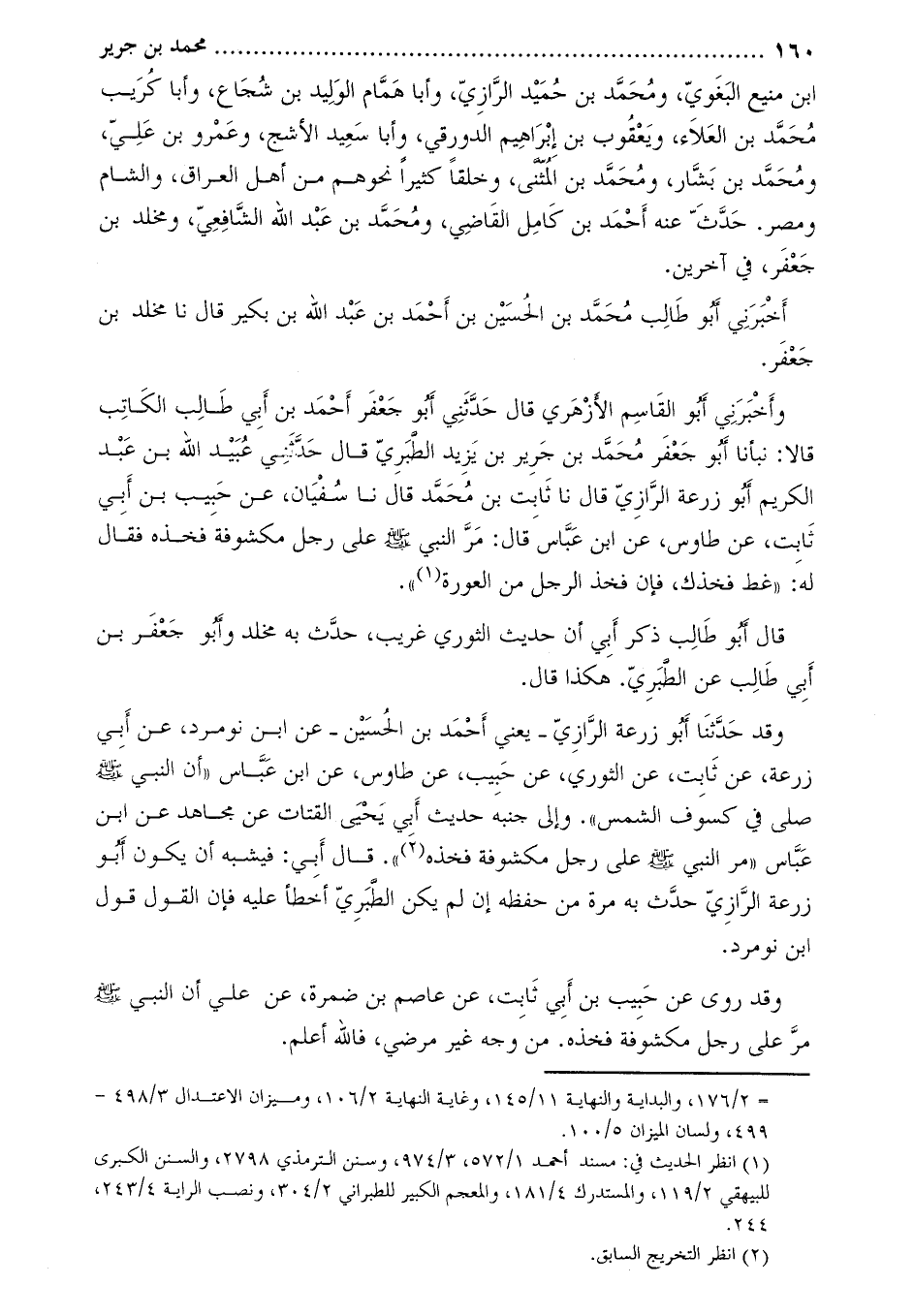 وَأَخْبَرَنِي أَبُو الْقَاسِمِ الأَزْهَرِيُّ قَالَ حَدَّثَنِي أَبُو جَعْفَرٍ أَحْمَد بْنُ أَبِي طالب الكاتب قالا: نبأنا أَبُو جَعْفَرٍ مُحَمَّدُ بْنُ جَرِيرِ بْنِ يَزِيدَ الطَّبَرِيُّ قَالَ حَدَّثَنِي عُبَيْدُ اللَّهِ بْنُ عَبْدِ الكريم أبو زرعة الرّازيّ قال نا ثابت بن محمّد قال نا سُفْيَانَ، عَنْ حَبِيبِ بْنِ أَبِي ثَابِتٍ، عَنْ طَاوُسٍ، عَنِ ابْنِ عَبَّاسٍ قَالَ: مَرَّ النَّبِيُّ صَلَّى اللَّهُ عَلَيْهِ وَسَلَّمَ عَلَى رَجُلٍ مَكْشُوفَةٍ فَخِذُهُ فَقَالَ لَهُ: «غَطِّ فَخِذَكَ، فَإِنَّ فَخِذَ الرَّجُلِ مِنَ الْعَوْرَةِ [1] »