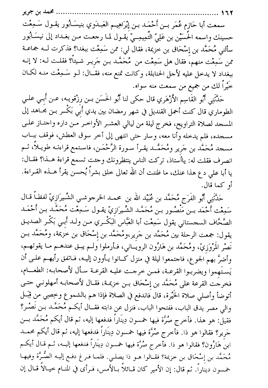 فقيل: هو هذا. فأخرج صرة فيها خمسون دينارا فدفعها إليه، ثم قَالَ أيكم محمد بن جرير؟ فقالوا هو ذا. فأخرج صرة فيها خمسون دينارا فدفعها إليه، ثم قَالَ أيكم محمد ابن هارون؟ فقالوا هو ذا. فأخرج صرة فيها خمسون دينارا فدفعها إليه، ثم قَالَ أيكم محمد بن إسحاق بن خزيمة؟ فقالوا هو ذا يصلي. فلما فرغ دفع إليه الصرة وفيها خمسون دينارا. ثم قَالَ: إن الأمير كان قائلا بالأمس، فرأى في المنام خيالا قَالَ إن