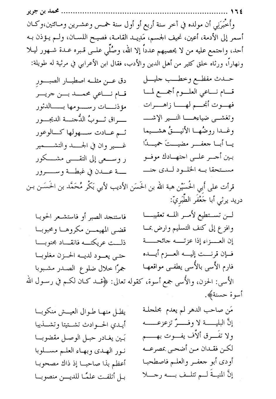 قرأت على أبي الحسين هبة الله بن الحسن الأديب لأبي بكر مُحَمَّد بن الحسن بن دريد يرثي أبا جعفر الطبري: