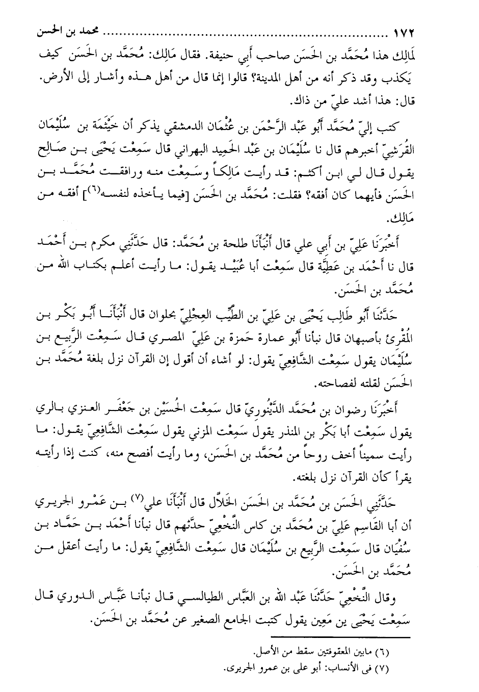حَدَّثَنِي الْحَسَنُ بْنُ مُحَمَّدِ بْنِ الْحَسَنِ الْخَلالُ قال أنبأنا علي [2] بن عمرو الجريري أن أبا القاسم عَلِيّ بْن مُحَمَّد بْن كاس النخعي حدثهم قال نبأنا أحمد بن حماد بن سفيان قَالَ سمعت الربيع بن سُلَيْمَان قَالَ سمعت الشَّافِعِيّ يَقُولُ: ما رأيت أعقل من محمد بن الحسن.