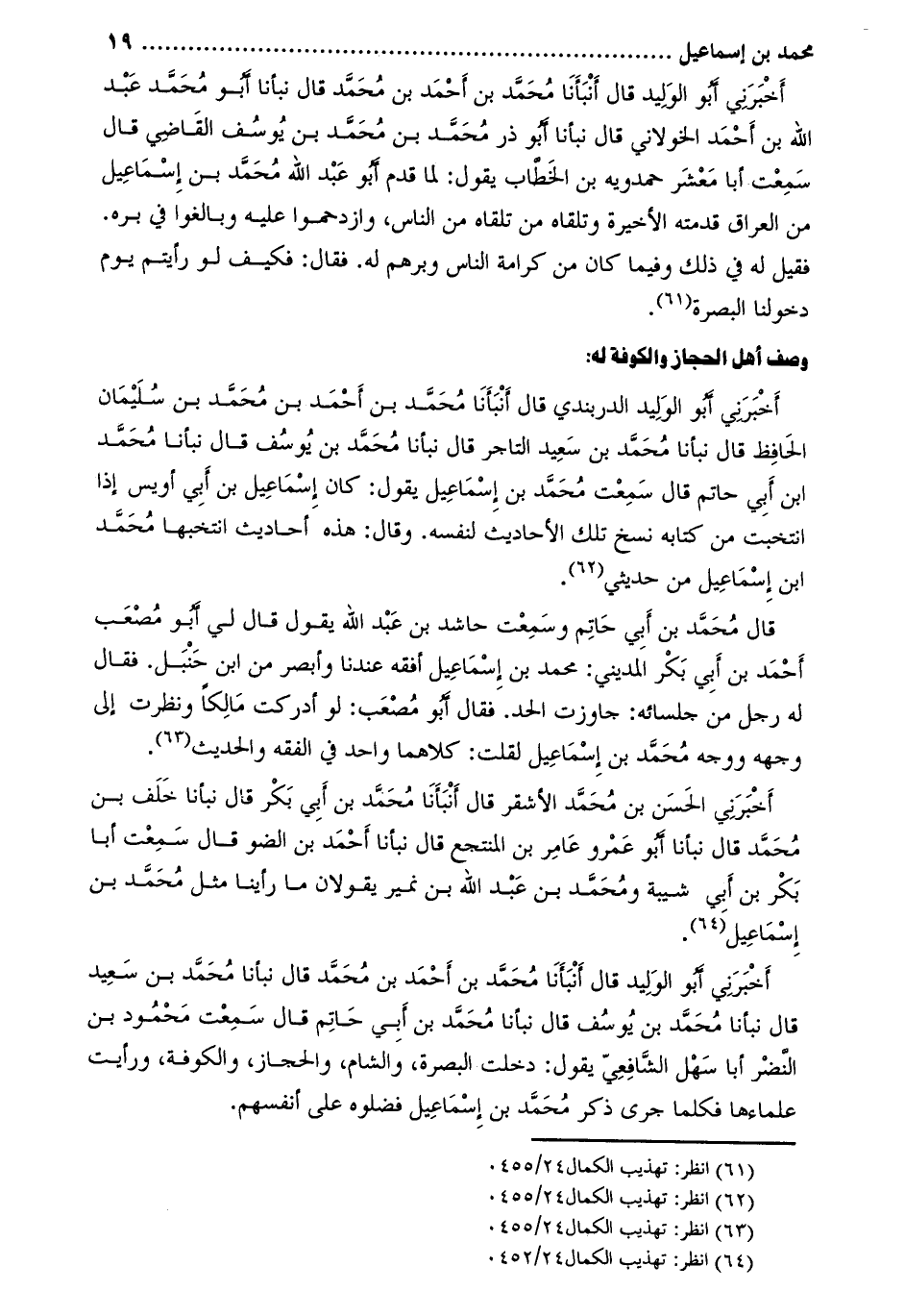 أَخْبَرَنِي أبو الوليد قَالَ أَنْبَأَنَا مُحَمَّدُ بْنُ أَحْمَدَ بْنِ مُحَمَّدِ قال نبأنا محمّد بن سعيد قال نبأنا محمّد بن يوسف قال نبأنا محمد بن أبي حاتم قَالَ سمعت محمود بن النضر أبا سهل الشافعي يقول: دخلت البصرة، والشام، والحجاز، والكوفة، ورأيت علماءها فكلما جرى ذكر محمد بن إسماعيل فضلوه على أنفسهم.