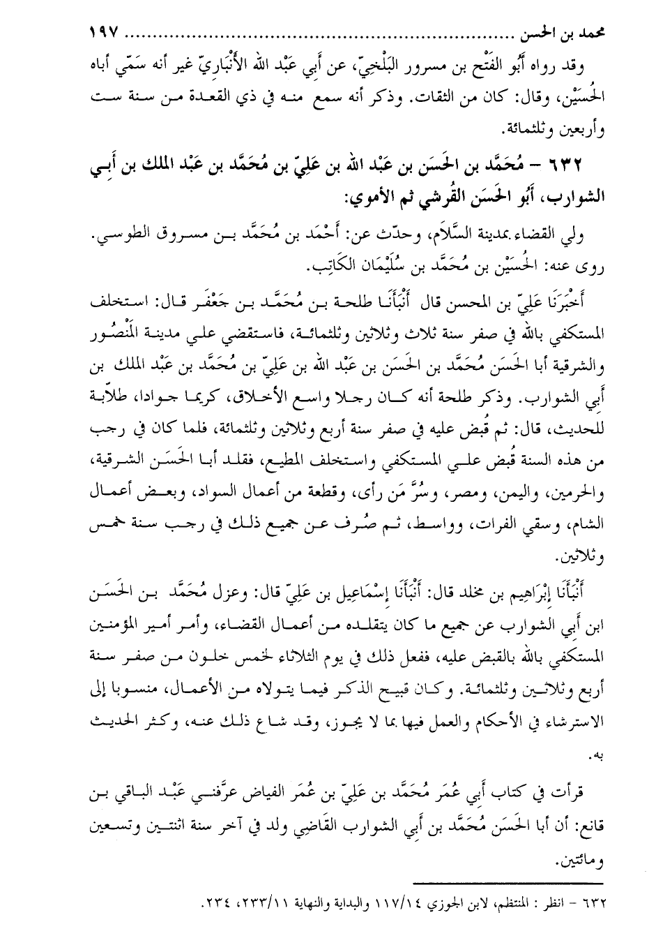 632- مُحَمَّد بْن الْحَسَن بْن عَبْدِ اللَّهِ بْنِ عَلِيّ بْن مُحَمَّد بْن عَبْد الملك بْن أبي الشوارب، أبو الحسن القرشي ثم الأموي [1] :