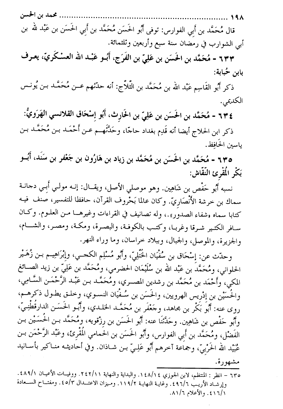 635- مُحَمَّدُ بْنُ الْحَسَنِ بْنِ مُحَمَّدِ بْنِ زِيَادٍ بن هارون بن جعفر بن سند، أبو بكر المقرئ النقاش [1] :