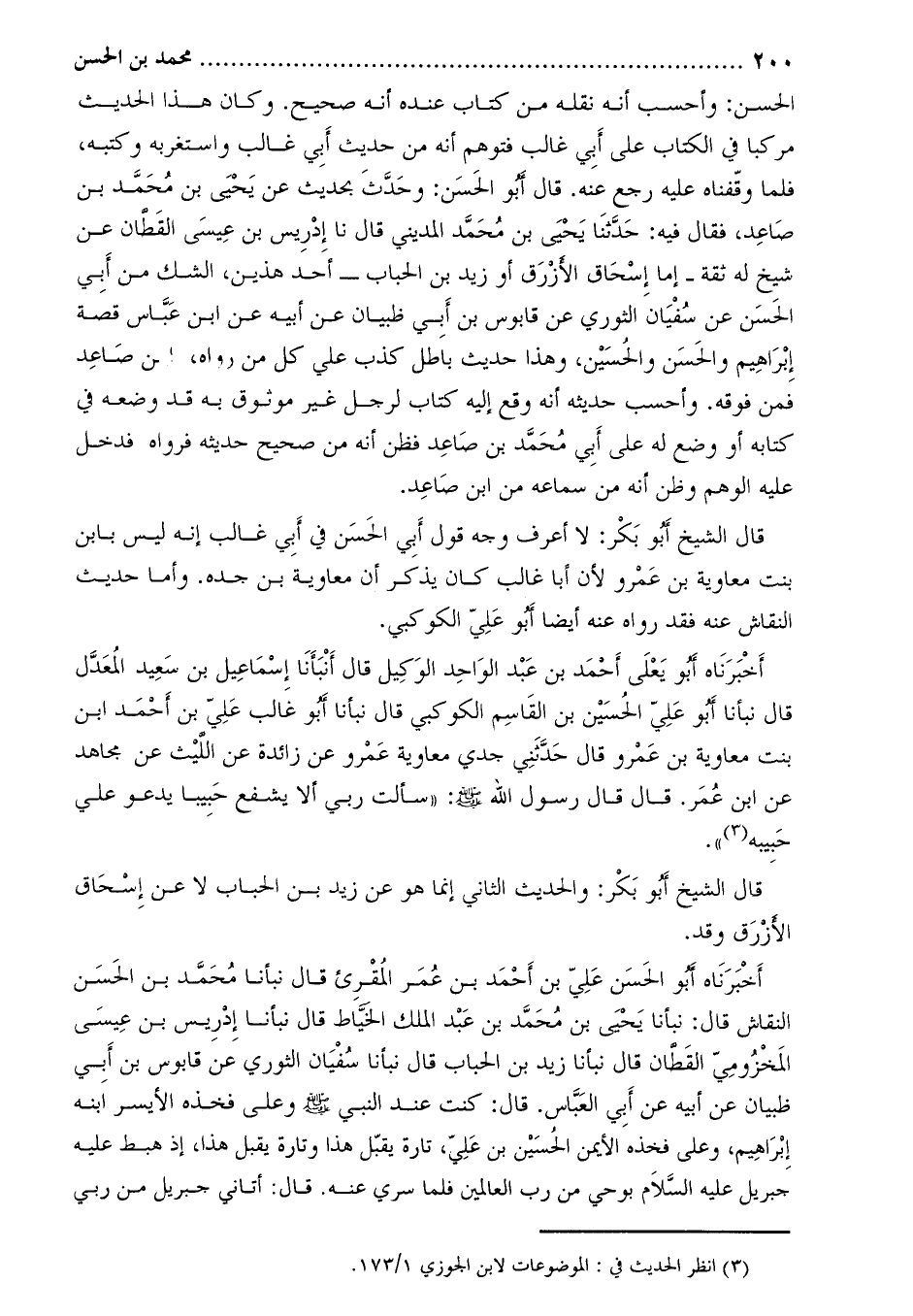 الْحَسَنِ: وَأَحْسَبُ أَنَّهُ نَقَلَهُ مِنْ كِتَابٍ عِنْدَهُ أَنَّهُ صَحِيحٌ. وَكَانَ هَذَا الْحَدِيثُ مُرَكَّبًا فِي الْكِتَابِ عَلَى أَبِي غالب فتوهم أَنَّهُ مِنْ حَدِيثٍ أَبِي غَالِبٍ وَاسْتَغْرَبَهُ وَكَتَبَهُ، فَلَمَّا وَقَفْنَاهُ عَلَيْهِ رَجَعَ عَنْهُ. قَالَ أبو الحسن: وحدث بحديث عن يحيى بن محمد بن صاعد، فقال فيه: حَدَّثَنَا يحيى بن محمد المديني قال نا إدريس بن عيسى القطان عن شيخ له ثقة- إما إسحاق الأزرق أو زيد بن الحباب- أحد هذين، الشك من أبي الحسن عن سفيان الثوري عَنْ قَابُوسَ بْنِ أَبِي ظَبْيَانَ عَنْ أَبِيهِ عن ابن عباس قصة إبراهيم والحسن والحسين، وهذا حديث باطل كذب على كل من رواه، ابن صاعد فمن فوقه. وأحسب حديثه أنه وقع إليه كتاب لرجل غير موثوق به قد وضعه في كتابه أو وضع له علي أبي محمد بن صاعد فظن أنه من صحيح حديثه فرواه فدخل عليه الوهم وظن أنه من سماعه من ابن صاعد.