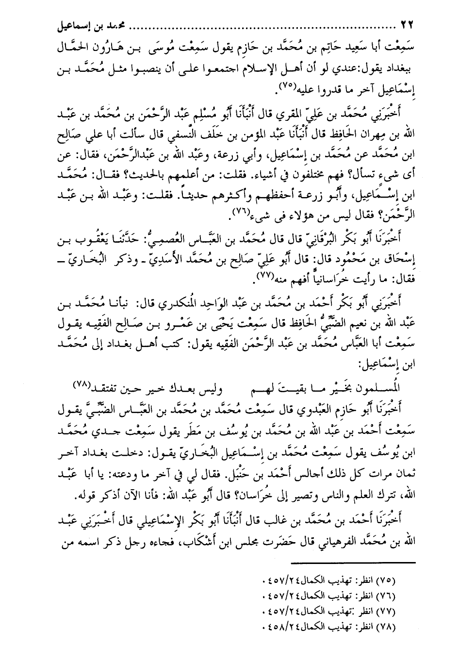 أَخْبَرَنَا أَبُو حازم العبدوي قَالَ سمعت مُحَمَّد بن محمد بن العباس الضبي يقول سمعت أَحْمَد بْن عَبْد اللَّه بْن مُحَمَّد بْن يوسف بن مطر يقول سمعت جدي محمّد ابن يوسف يقول سمعت محمد بن إسماعيل البخاري يقول: دخلت بغداد آخر ثمان مرات كل ذلك أجالس أحمد بن حنبل. فقال لي في آخر ما ودعته: يا أبا عبد الله، تترك العلم والناس وتصير إلى خراسان؟ قَالَ أبو عبد الله: فأنا الآن أذكر قوله.