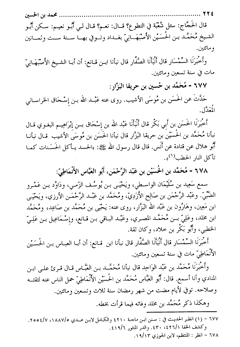 أَخْبَرَنَا الْحَسَنُ بْنُ أَبِي بكر قال أنبأنا عَبْدُ اللَّهِ بْنُ إِسْحَاقَ بْنِ إِبْرَاهِيمَ الْبَغَوِيُّ قال نبأنا محمّد بن الحسين بن حريقا البزّار قال نبأنا الحسن بن موسى الأشيب قال نبأنا أَبُو هِلالٍ عَنْ قَتَادَةَ عَنْ أَنَسٍ. قَالَ قَالَ رَسُولُ اللَّهِ صَلَّى الله عليه وسلم: «الْحَسَدُ يَأْكُلُ الْحَسَنَاتِ كَمَا تَأْكُلُ النَّارُ الْحَطَبَ [1] »