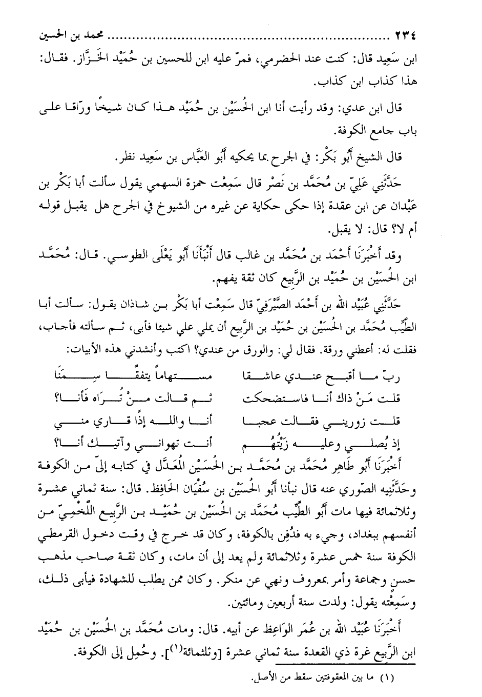 وقد أَخْبَرَنَا أحمد بن محمد بن غالب قال أنبأنا أبو يعلى الطوسي. قال: محمّد ابن الحسين بن حميد بن الربيع كان ثقة يفهم.