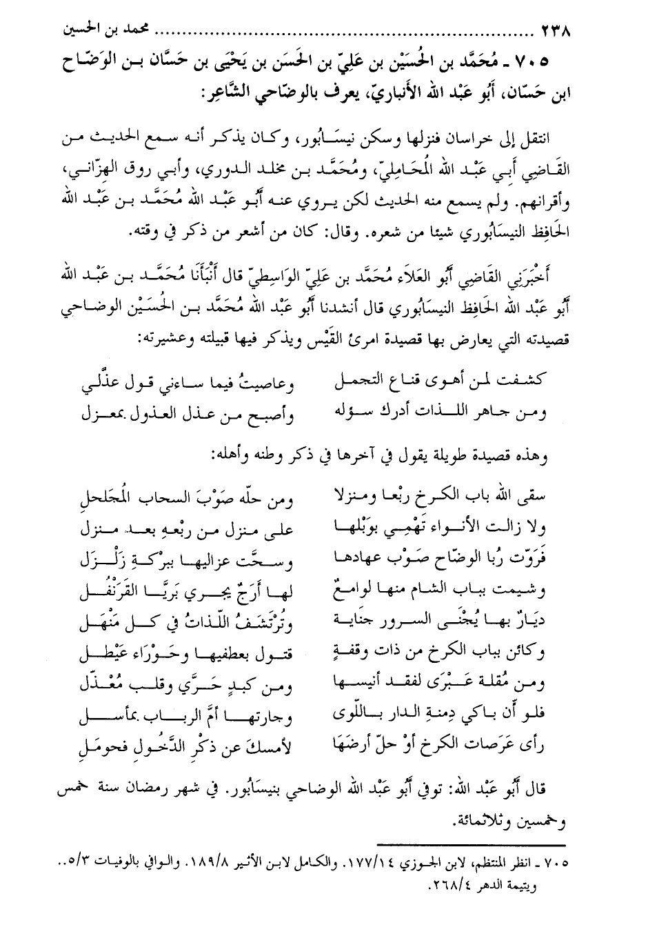705- محمد بن الحسين بن علي بن الحسن بن يحيى بن حسّان بن الوضّاح ابن حسّان، أبو عبد الله الأنباريّ، يعرف بالوضّاحي الشاعر [1] :