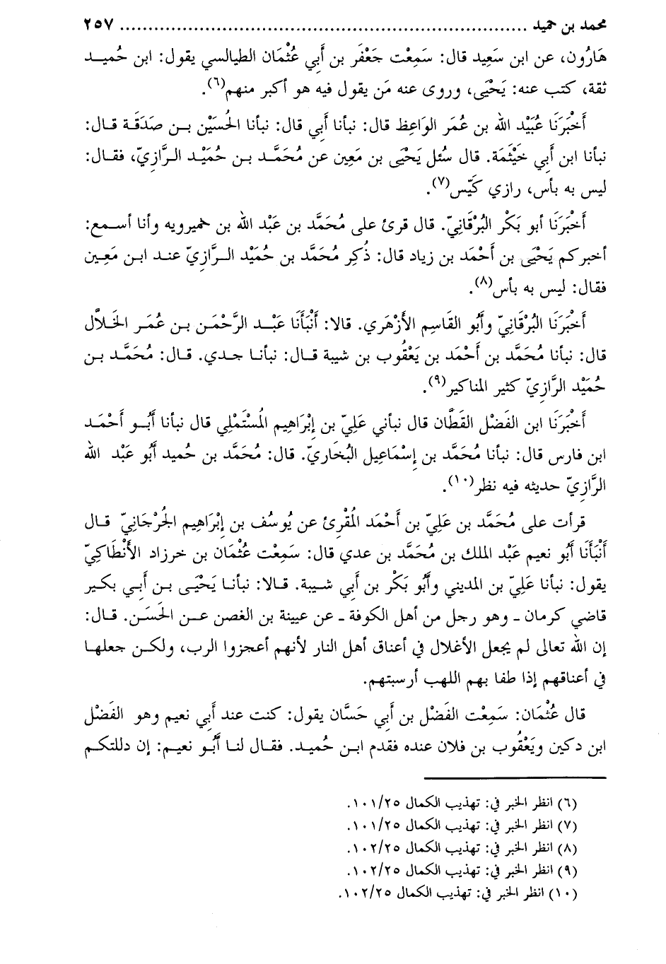 أَخْبَرَنَا البرقاني وأبو القاسم الأزهري. قالا: أنبأنا عبد الرّحمن بن عمر الخلّال قال: نبأنا محمد بن أحمد بن يعقوب بن شيبة قال: نبأنا جدي. قَالَ: محمد بن حميد الرازي كثير المناكير [4] .