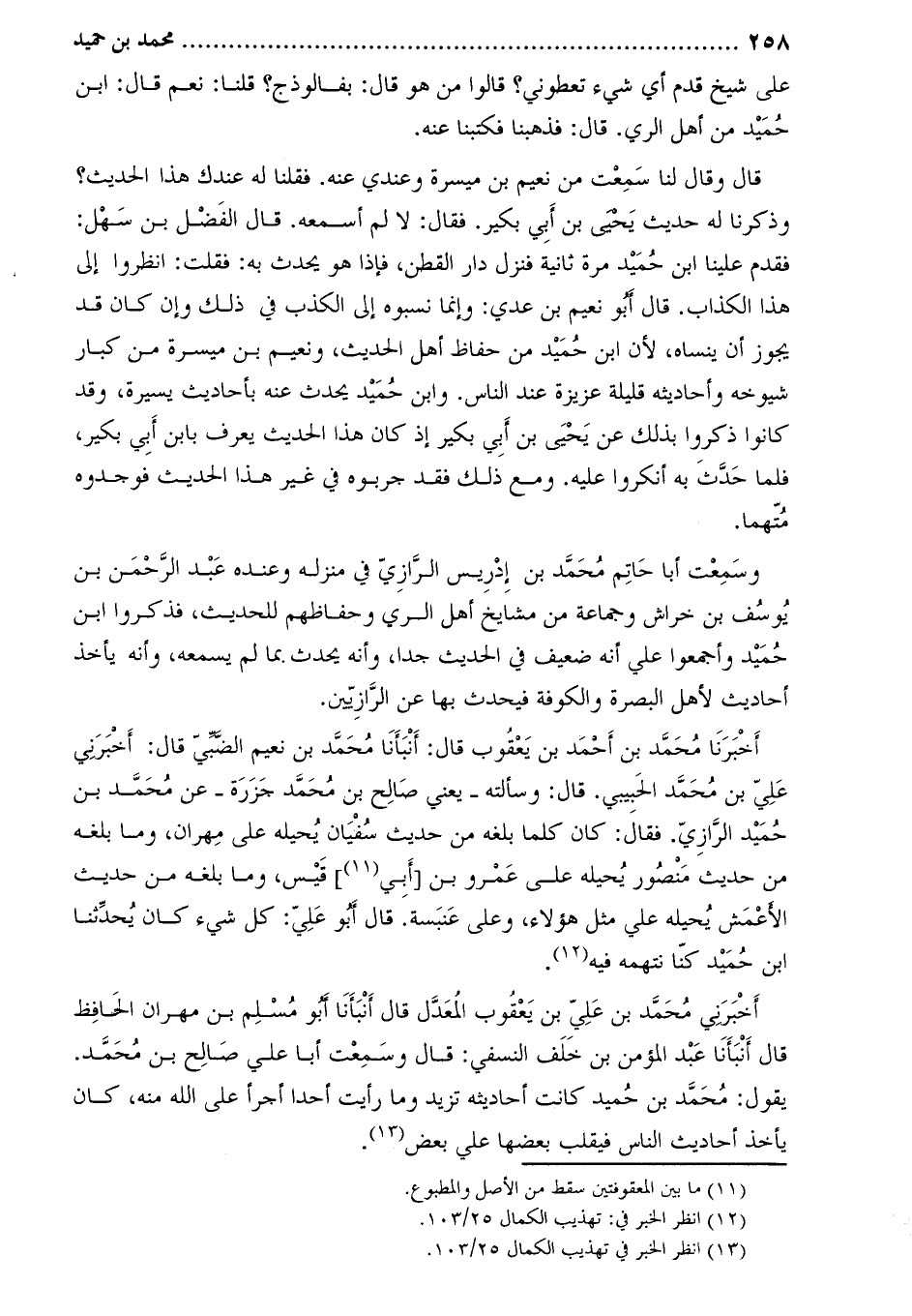 وسمعت أبا حاتم محمد بن إدريس الرازي في منزله وعنده عبد الرحمن بن يوسف بن خراش وجماعة من مشايخ أهل الري وحفاظهم للحديث، فذكروا ابن حميد وأجمعوا على أنه ضعيف في الحديث جدا، وأنه يحدث بما لم يسمعه، وأنه يأخذ أحاديث لأهل البصرة والكوفة فيحدث بها عن الرازيين.