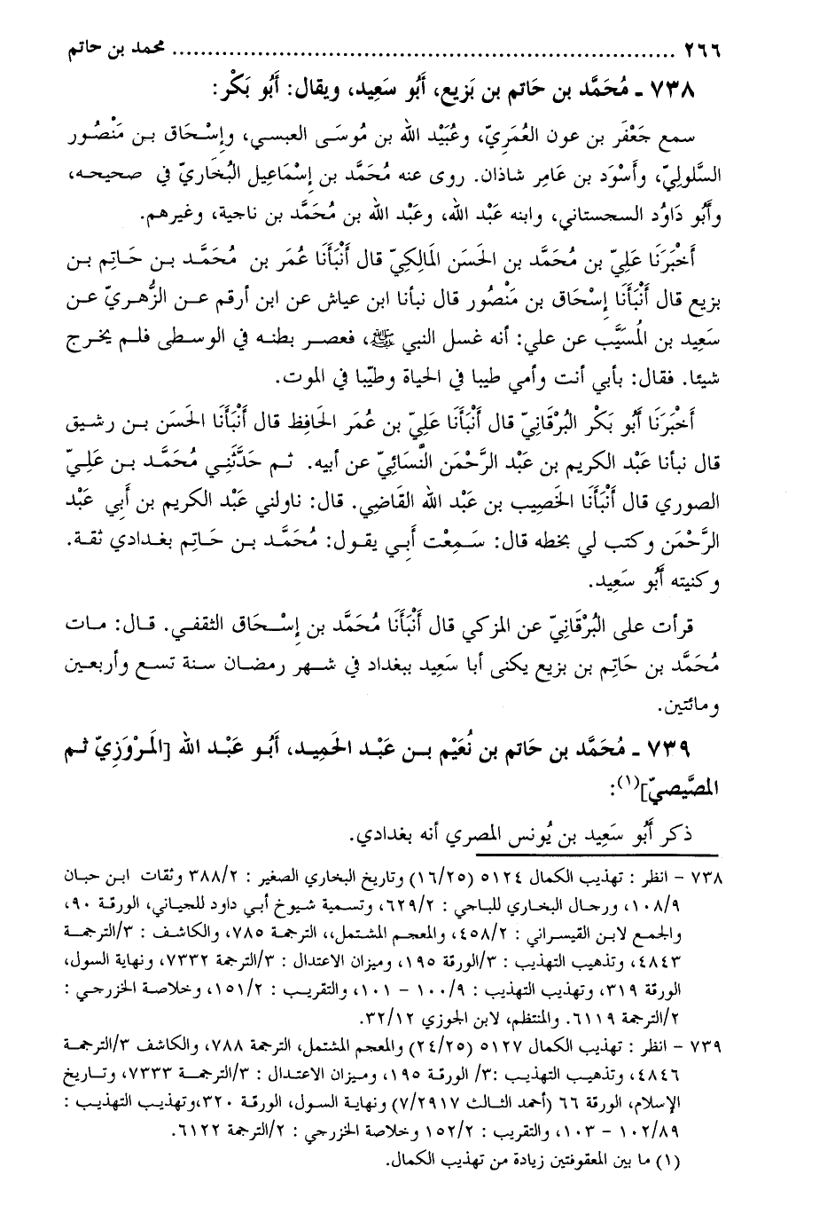 [2] 739- انظر: تهذيب الكمال 5127 (25/24) والمعجم المشتمل، الترجمة 788، والكاشف 3/الترجمة 4846، وتذهيب التهذيب: 3/الورقة 195، وميزان الاعتدال: 3/الترجمة 7333، وتاريخ الإسلام، الورقة 66 (أحمد الثالث 2917/7) ونهاية السول، الورقة 320، وتهذيب التهذيب: