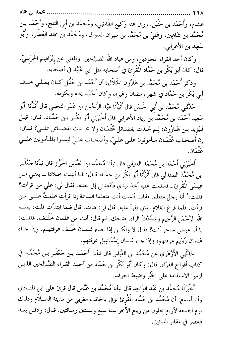 حَدَّثَنِي الأزهري عن مُحَمَّد بن العباس قَالَ نبأنا أحمد بن جعفر بن محمد في كتاب أفواج القراء. قَالَ: وكان أبو بكر بن حماد من أحد القراء الصالحين الذين لزموا الاستقامة على الخير وضبط الحرف.