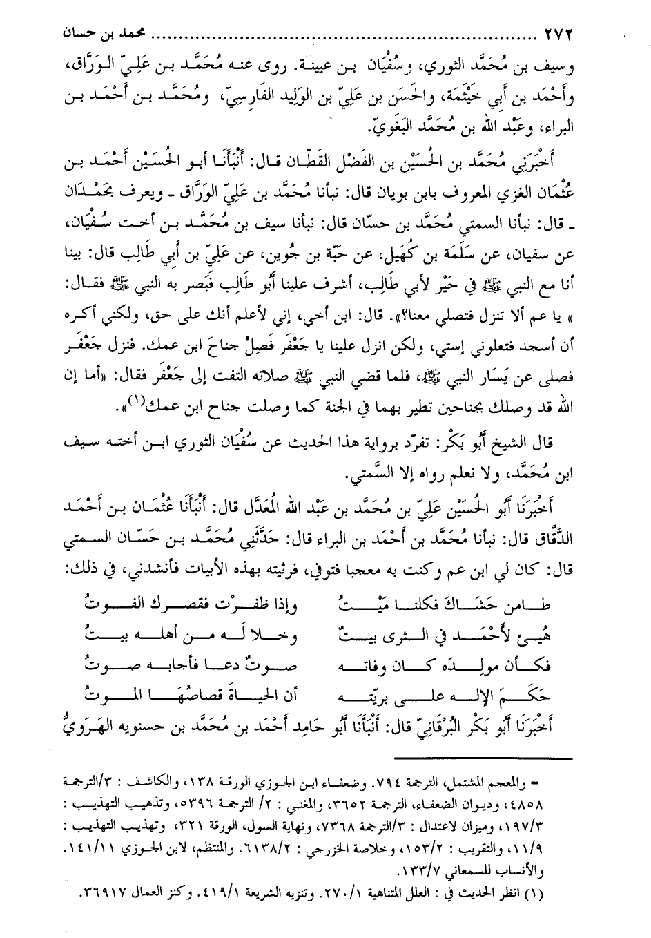 أَخْبَرَنِي مُحَمَّدُ بْنُ الْحُسَيْن بْن الْفَضْل القطان قال: أنبأنا أبو الحسين أحمد بن عثمان الغزي المعروف بابن بويان قال: نبأنا مُحَمَّدُ بْنُ عَلِيٍّ الْوَرَّاقُ- وَيُعْرَفُ بِحَمْدَانَ- قَالَ: نبأنا السمتي محمّد بن حسّان قال: نبأنا سيف بن محمّد بن أُخْتِ سُفْيَانَ، عَنْ سُفْيَانَ، عَنْ سَلَمَةَ بْنِ كُهَيْلٍ، عَنْ حَبَّةَ بْنِ جُوَيْنٍ، عَنْ عَلِيِّ بْنِ أَبِي طَالِبٍ قَالَ: بَيْنَا أَنَا مَعَ النَّبِيِّ صَلَّى اللَّهُ عَلَيْهِ وَسَلَّمَ فِي حَيْرٍ لأَبِي طَالِبٍ، أَشْرَفَ عَلَيْنَا أَبُو طَالِبٍ فَبَصُرَ بِهِ النَّبِيُّ صَلَّى اللَّهُ عَلَيْهِ وَسَلَّمَ فَقَالَ:
