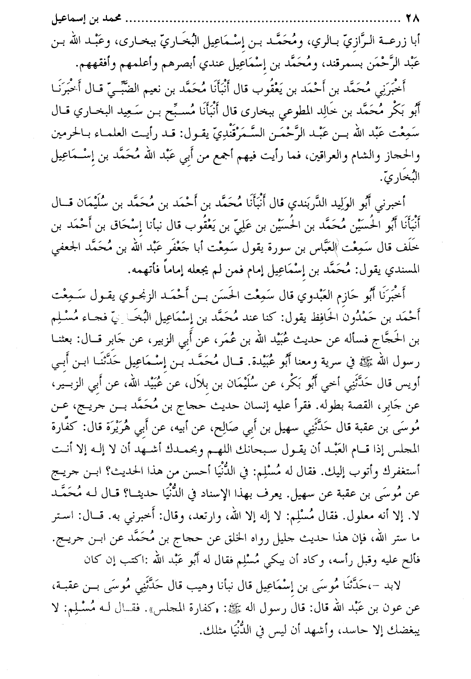 أخبرنا أبو حازم العبدوي قال سمعت الحسن بن أحمد الزنجوي يَقُولُ سَمِعْتُ أَحْمَدَ بْنَ حَمْدُونَ الْحَافِظَ يَقُولُ: كُنَّا عِنْدَ مُحَمَّدِ بْنِ إِسْمَاعِيلَ الْبُخَارِيِّ فَجَاءَ مُسْلِمُ بْنُ الْحَجَّاجِ فَسَأَلَهُ عَنْ حَدِيثِ عُبَيْدِ اللَّهِ بْنِ عُمَرَ، عَنْ أَبِي الزُّبَيْرِ، عَنْ جَابِرٍ قَالَ: بَعَثَنَا رَسُولُ اللَّهِ صَلَّى اللَّهُ عَلَيْهِ وَسَلَّمَ فِي سَرِيَّةٍ وَمَعَنَا أَبُو عُبَيْدَةَ. قال مُحَمَّدُ بْنُ إِسْمَاعِيلَ حَدَّثَنَا ابْنُ أَبِي أُوَيْسٍ قَالَ حَدَّثَنِي أَخِي أَبُو بَكْرٍ، عَنْ سُلَيْمَانَ بْنِ بِلالٍ، عَنْ عُبَيْدِ اللَّهِ، عَنْ أَبِي الزُّبَيْرِ، عَنْ جَابِرٍ، الْقِصَّةَ بِطُولِهِ. فَقَرَأَ عَلَيْهِ إنسان حديث حجاج بن محمّد بن جُرَيْجٍ، عَنْ مُوسَى بْنِ عُقْبَةَ قَالَ حَدَّثَنِي سُهَيْلُ بْنُ أَبِي صَالِحٍ، عَنْ أَبِيهِ، عَنْ أَبِي هُرَيْرَةَ قَالَ: كَفَّارَةُ الْمَجْلِسِ إِذَا قَامَ الْعَبْدُ أَنْ يَقُولَ سُبْحَانَكَ اللَّهُمَّ وَبِحَمْدِكَ أَشْهَدُ أَنْ لا إِلَهَ إِلا أَنْتَ أَسْتَغْفِرُكَ وَأَتُوبُ إِلَيْكَ. فَقَالَ لَهُ مُسْلِمٌ: فِي الدُّنْيَا أَحْسَنُ مِنْ هَذَا الْحَدِيثِ؟ ابْنُ جُرَيْجٍ عَنْ مُوسَى بْنِ عُقْبَةَ عَنْ سُهَيْلٍ. يُعْرَفُ بِهَذَا الإِسْنَادِ في الدّنيا حديثا؟ قال له مُحَمَّدٌ لا. إِلا أَنَّهُ مَعْلُولٌ. فَقَالَ مُسْلِمٌ: لا إله إلا الله، وارتعد، وقَالَ: أَخْبَرَنِي بِهِ. قَالَ: اسْتُرْ مَا سَتَرَ اللَّهُ، فَإِنَّ هَذَا حَدِيثٌ جَلِيلٌ رَوَاهُ الْخَلْقُ عَنْ حَجَّاجِ بْنِ مُحَمَّدٍ عَنِ ابْنِ جُرَيْجٍ.